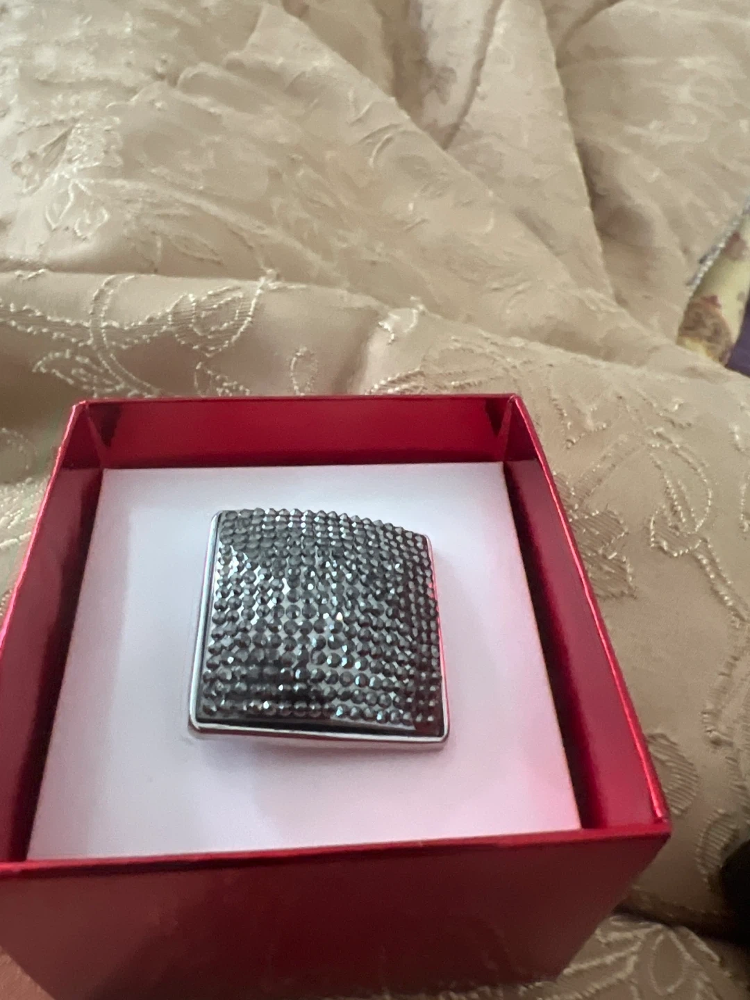 Sparkly square brooch covered in rhinestones. It's in a silver-tone setting. Comes in a red gift box.
