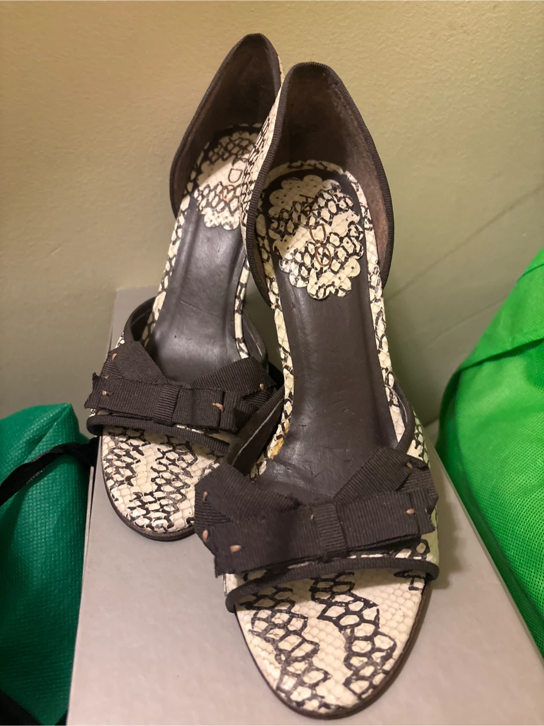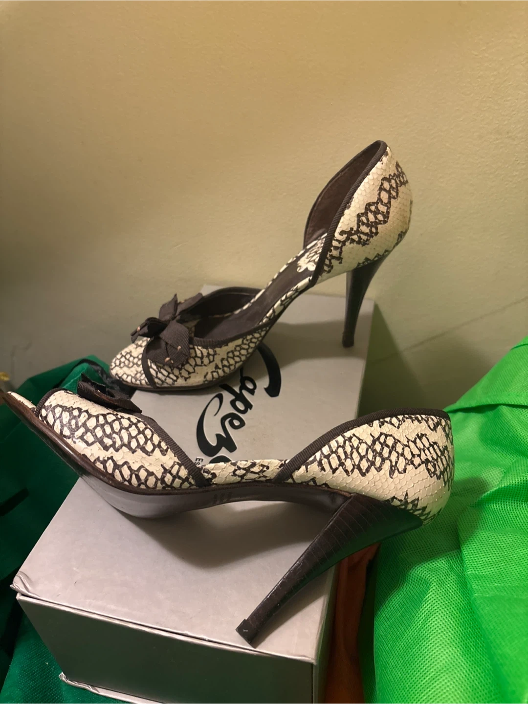 Also shoes with heels feature a snakeskin print and a cute bow detail. They are a size 7 and would be a stylish addition to any outfit