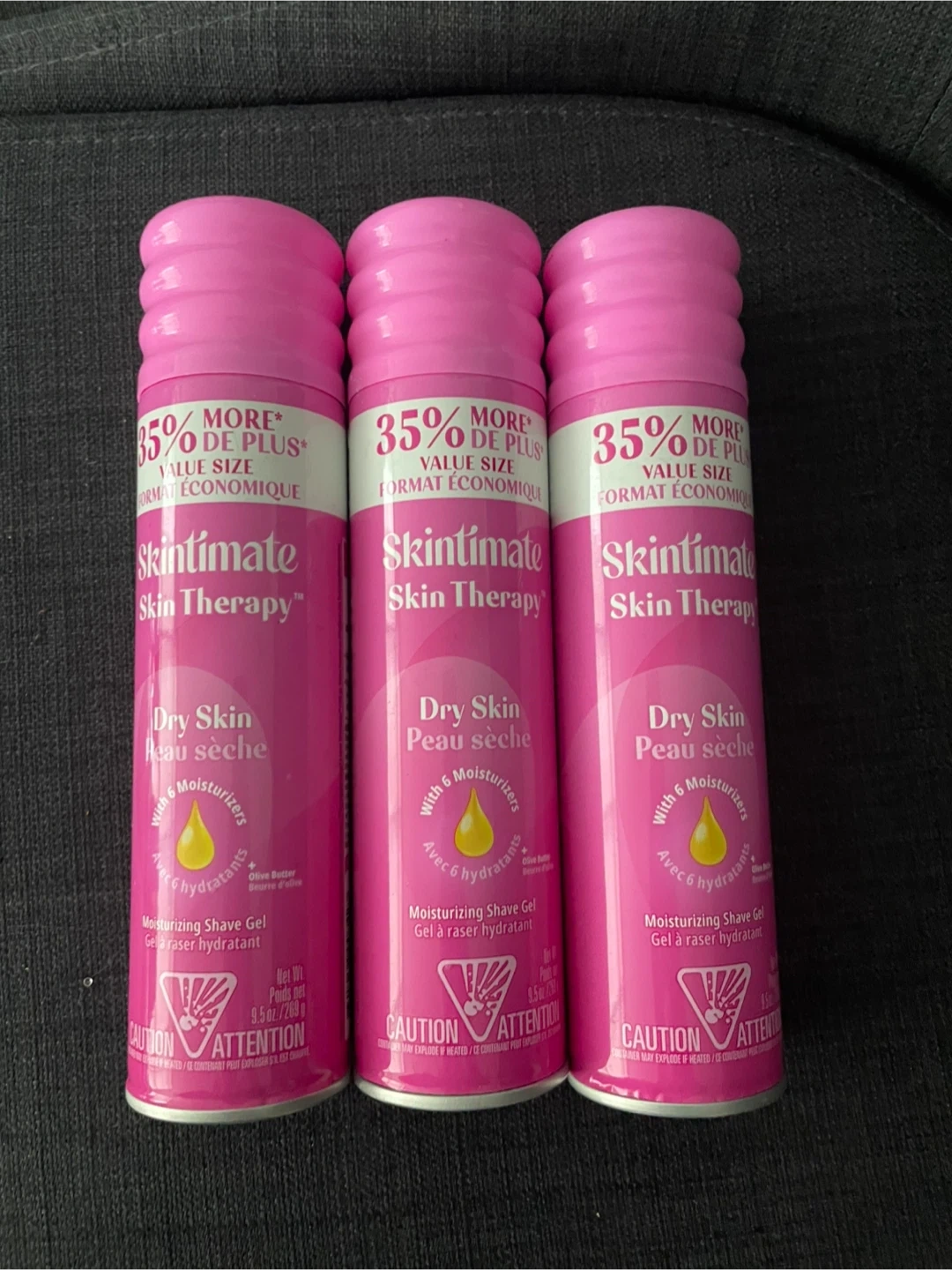 Selling three cans of Skintimate Skin Therapy moisturizing shave gel for dry skin! Each can is 9.5 oz/269g. The shave gel includes 6 moisturizers with olive butter.