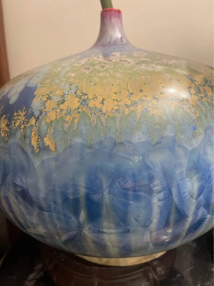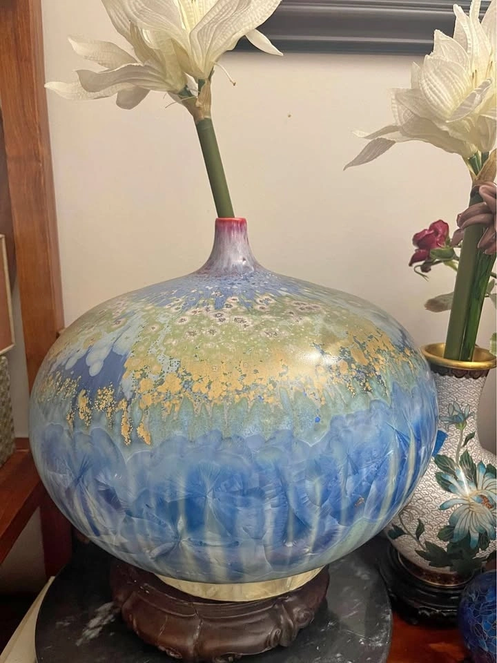 Gorgeous Blue Green Gold Crystalline Glaze Vase w/ Stand