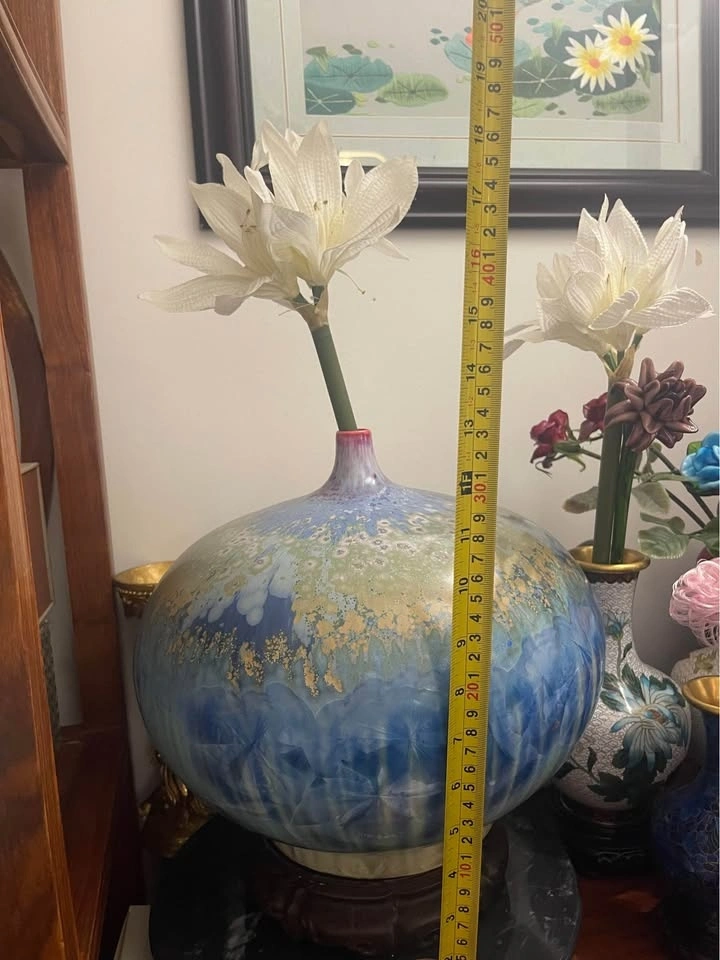 Stunning vase with a unique blue, green, and gold crystalline glaze. Comes with a wooden stand. The vase is about 11.5 inches tall and around 10.5 inches wide. Made in Jing De Zhen, China.