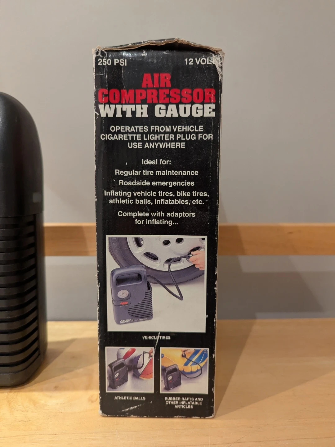 This black 250 PSI 12V air compressor with gauge is perfect for vehicle tire maintenance and inflating various items. It operates from a vehicle cigarette lighter plug. Includes adaptors for inflating tires, athletic balls, and other inflatables.