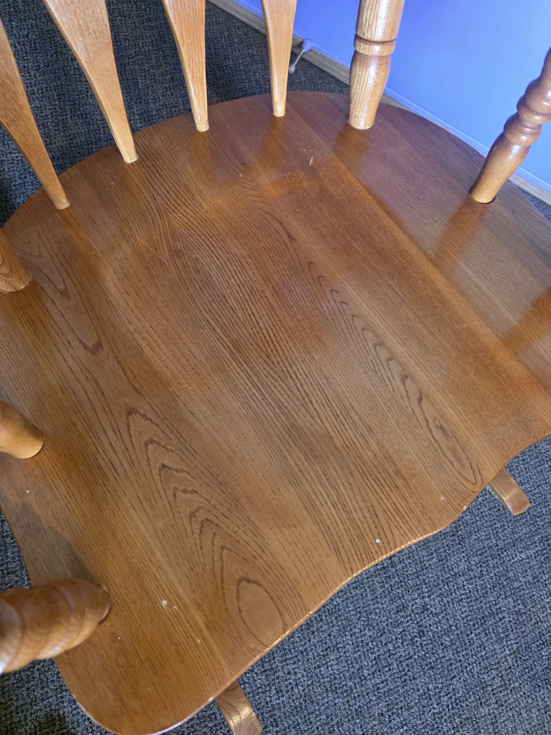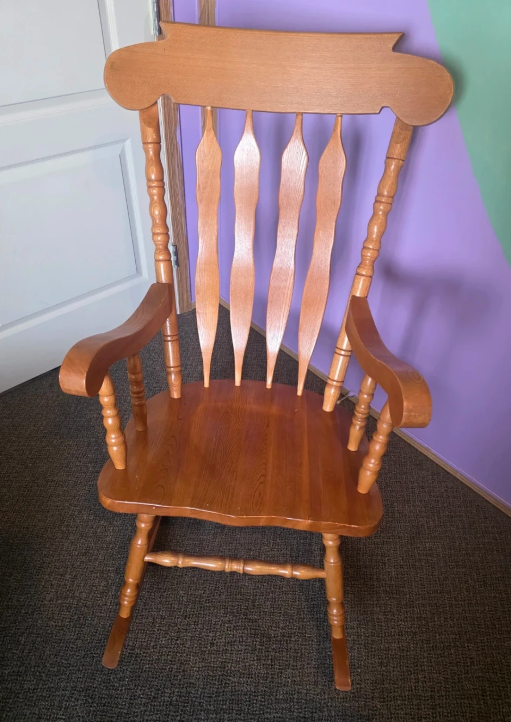 Wooden rocking chair. A few surface scratches but otherwise very sturdy and in great condition. Pick up is preferred, but delivery is an option for an additional fee.