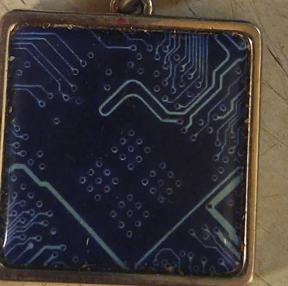 This is a pendant featuring a circuit board design. It has a square shape and a metal frame. It's a unique piece for anyone interested in technology or electronics!