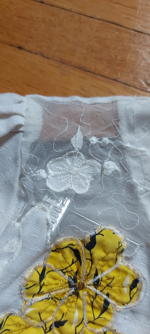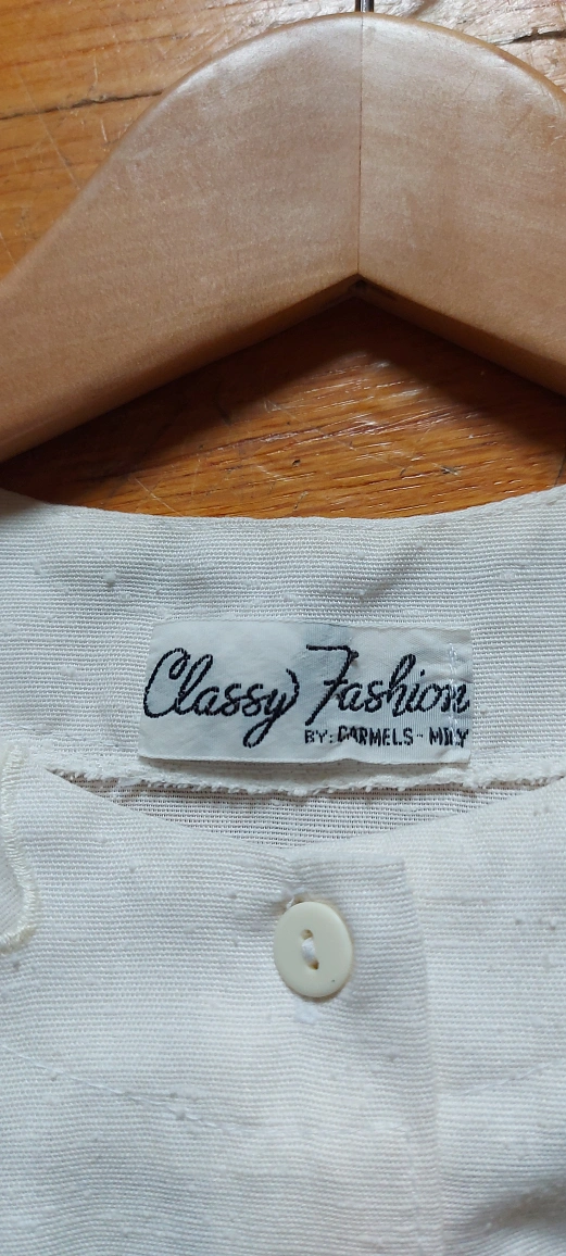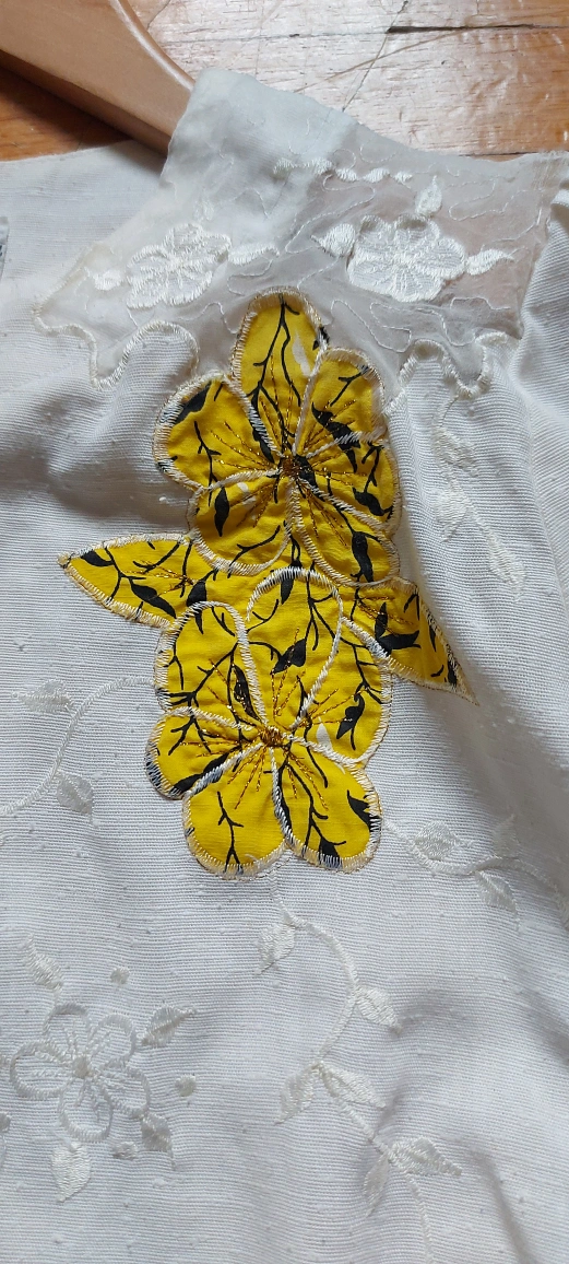 This is a charming white blouse from Classy Fashion by Carmels Mily. It features beautiful yellow floral appliques and delicate lace detailing on the shoulders and neckline. It is in great condition and ready for a new home!