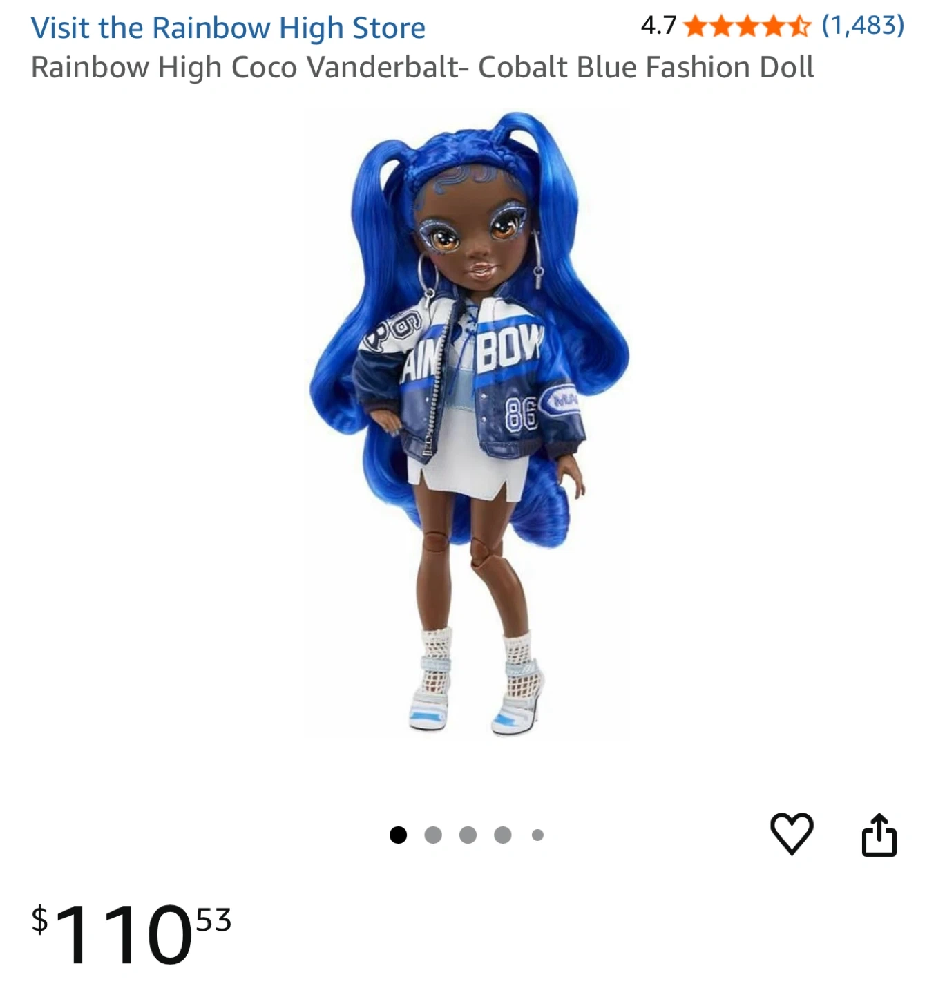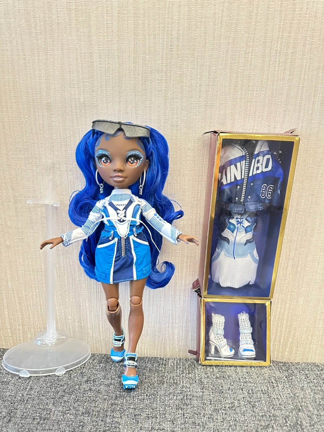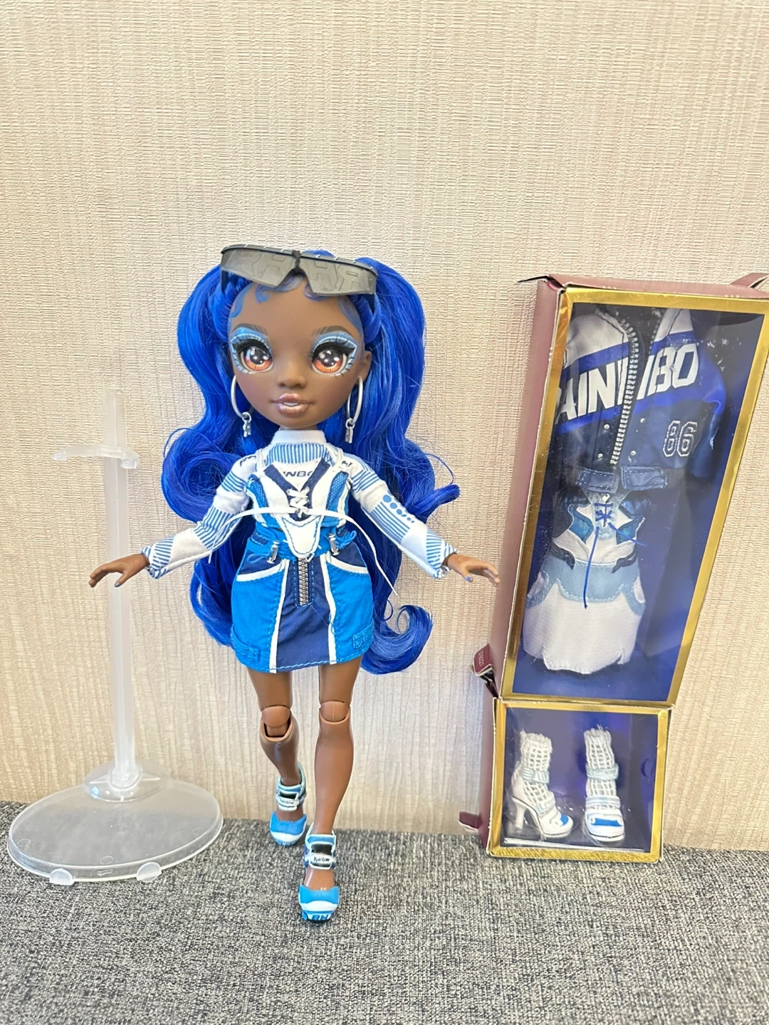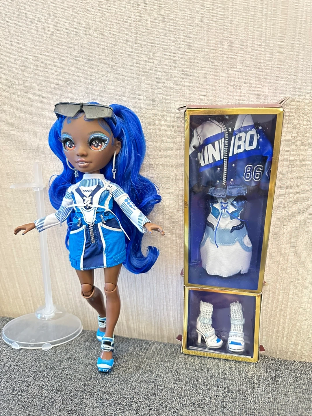 This is the Rainbow High Coco Vander doll in Cobalt Blue. She comes with her original outfit, a jacket, a skirt, and shoes. The doll features long, wavy blue hair and detailed makeup. It's a great toy for fashion doll enthusiasts!