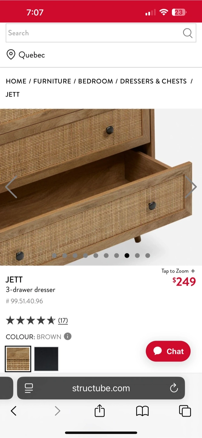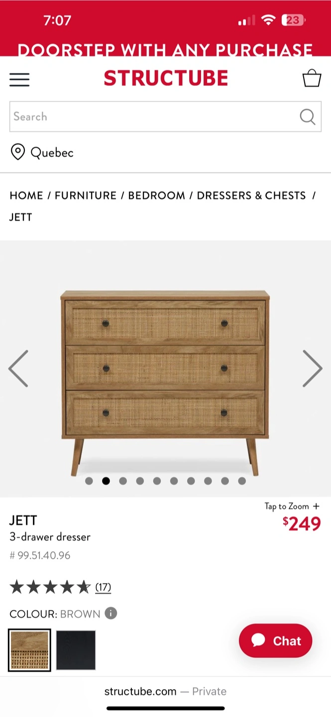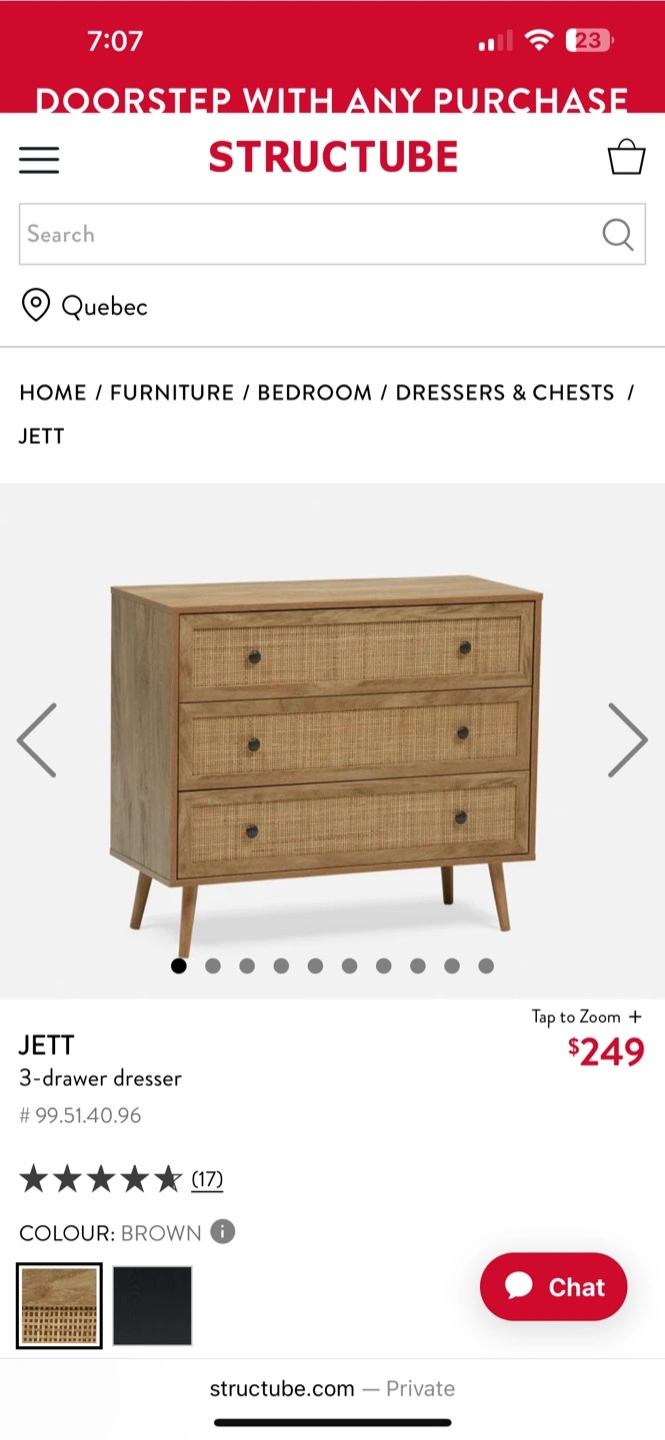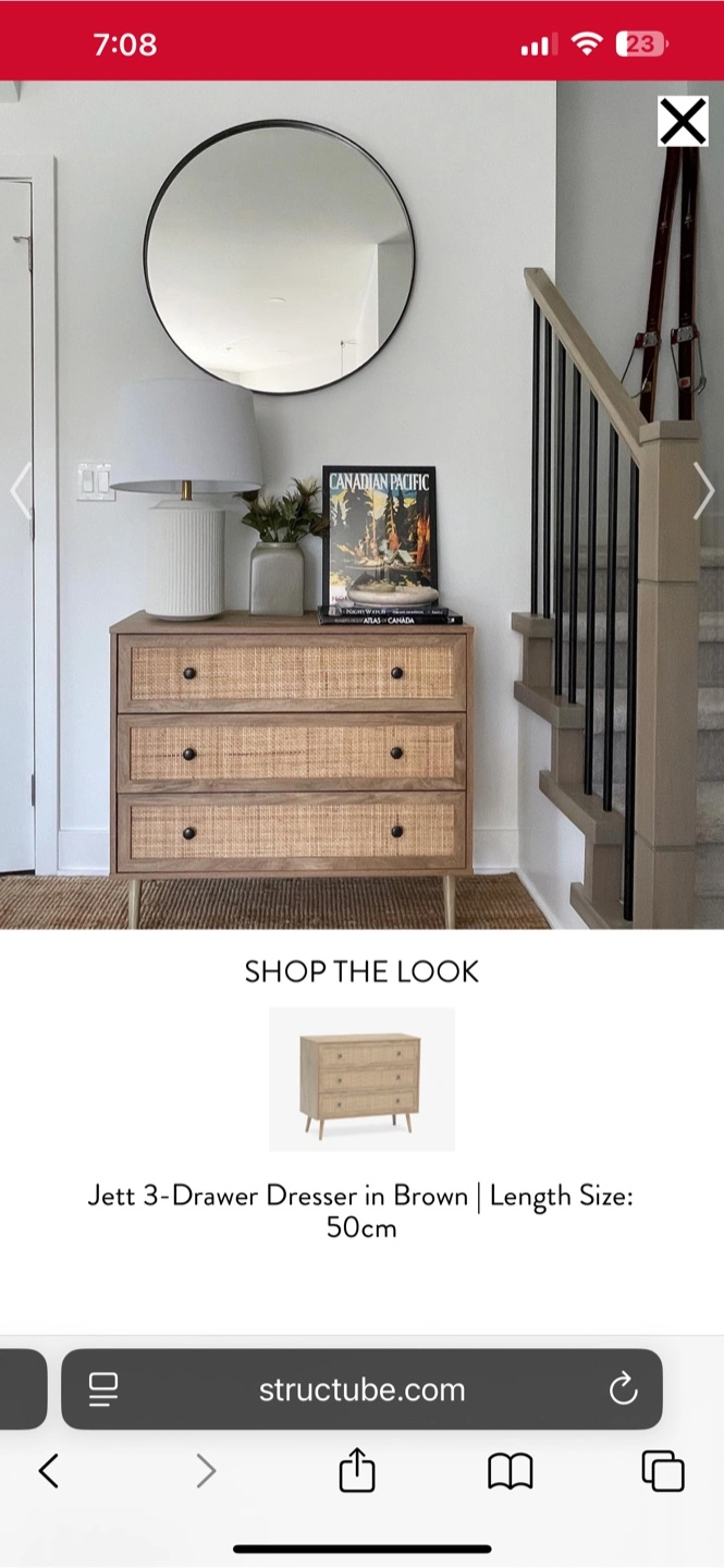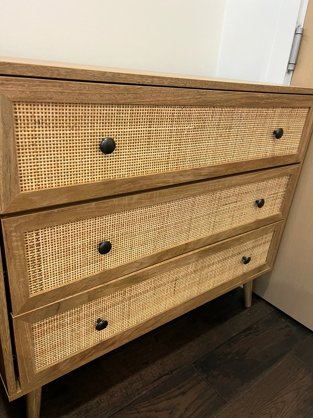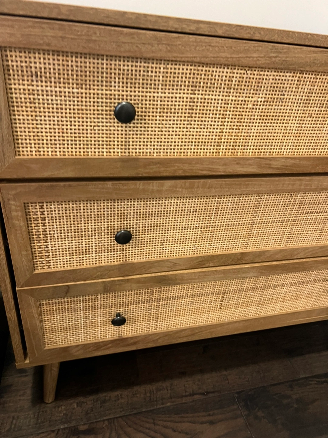 Looking to sell this Structube Jett 3-drawer dresser in brown! It features a stylish design with rattan drawer fronts. This dresser originally retailed for $249 and would be a great addition to any bedroom.
