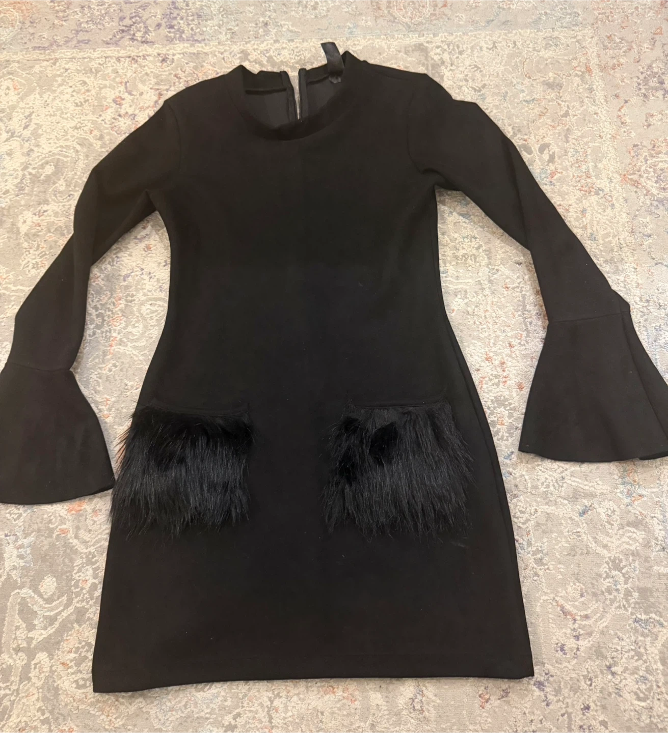 This black dress features stylish flared bell sleeves and unique fur-trimmed pockets. It's made from a soft material and has a back zipper closure. Great for a night out!