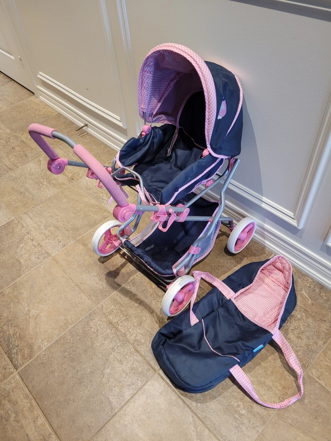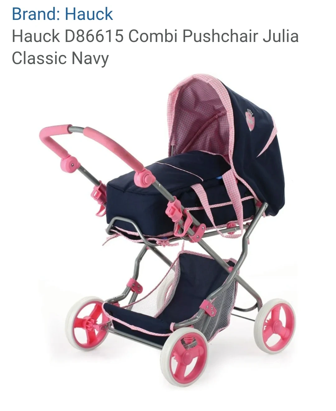 This Hauck Combi Pushchair Julia is perfect for little ones to take their dolls for a stroll. It's a navy and pink classic design with a removable carrycot. A great toy for imaginative play!