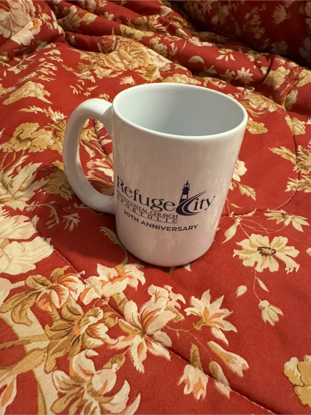 White ceramic mug from Refuge City Pentecostal Church's 20th anniversary. Standard mug size, made of ceramic material. Great for enjoying your favourite hot beverage!
