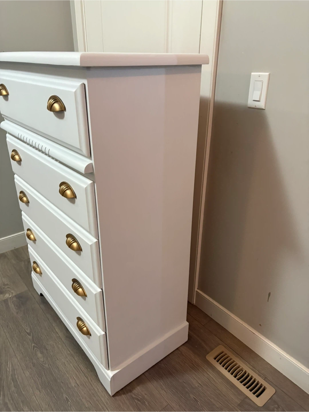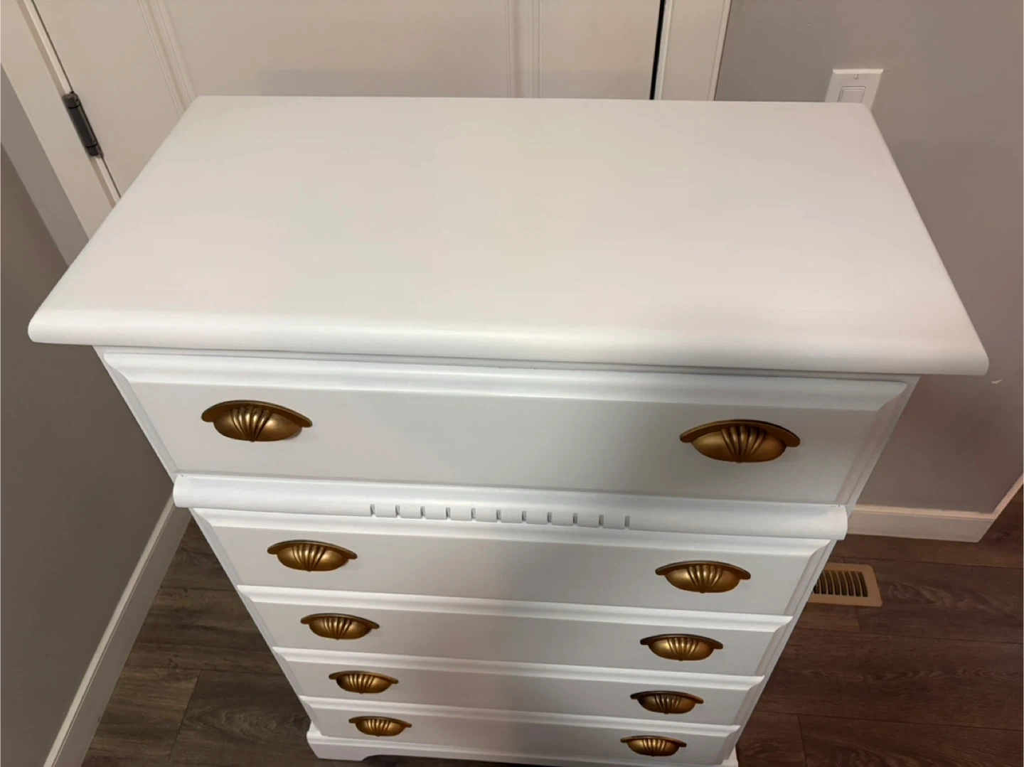 This is a refinished white chest of drawers with five spacious drawers and gold hardware. This piece offers ample storage while adding a touch of elegance to any room. Drawers are on rolls and slide smooth.