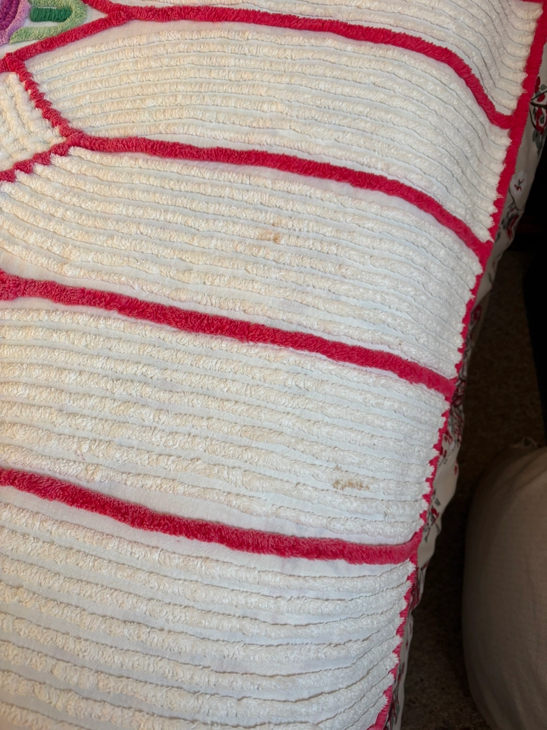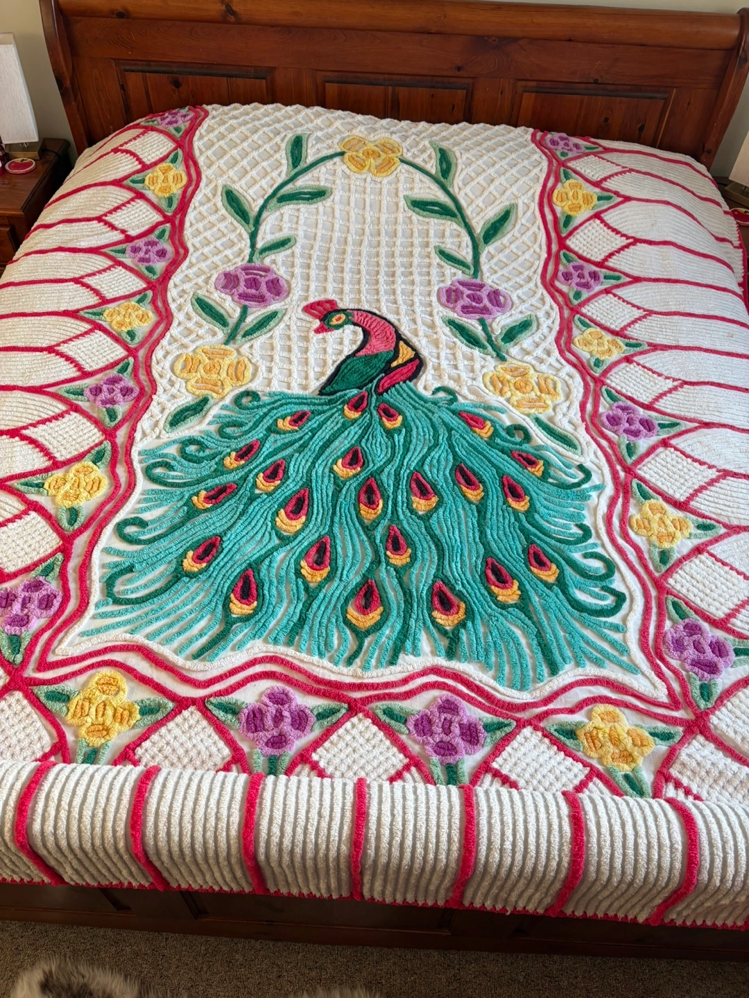 Selling a vintage mid century chenille bedspread featuring a beautiful peacock design. It has some slight wear, as seen in the photos, but is otherwise in good condition. Adds a unique, vintage touch to any bedroom!