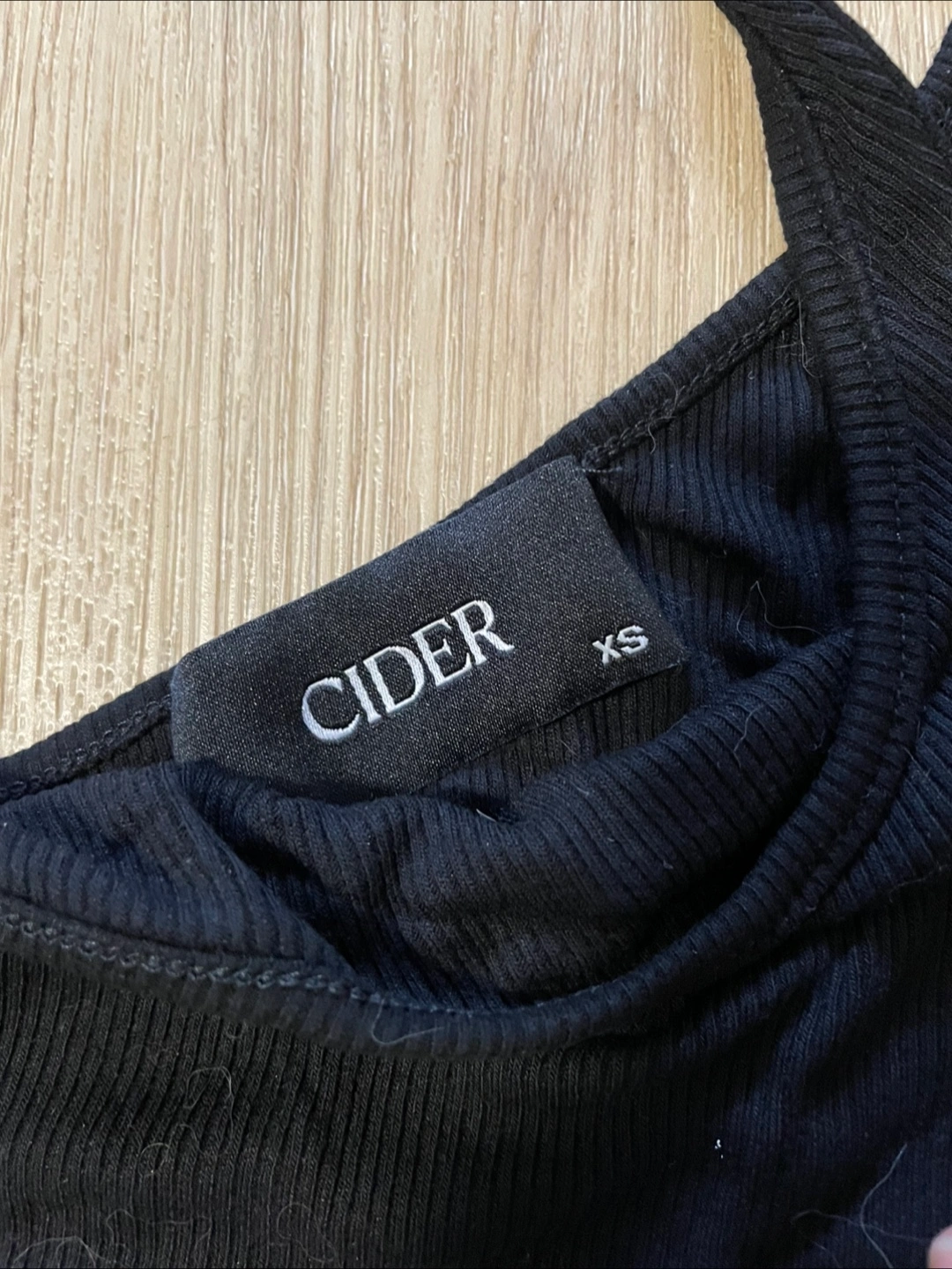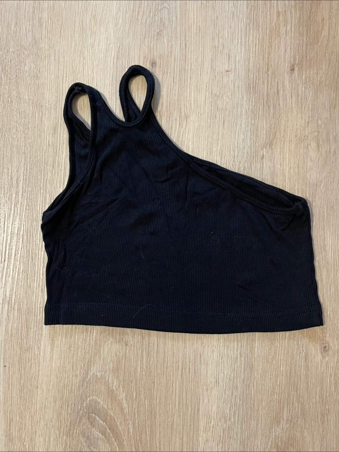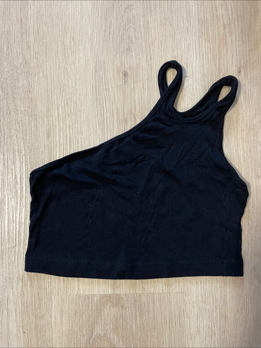 Cropped asymmetrical black top. Ribbed material. Features one shoulder strap. Can wear casual or dressed up.