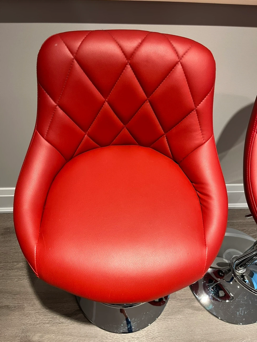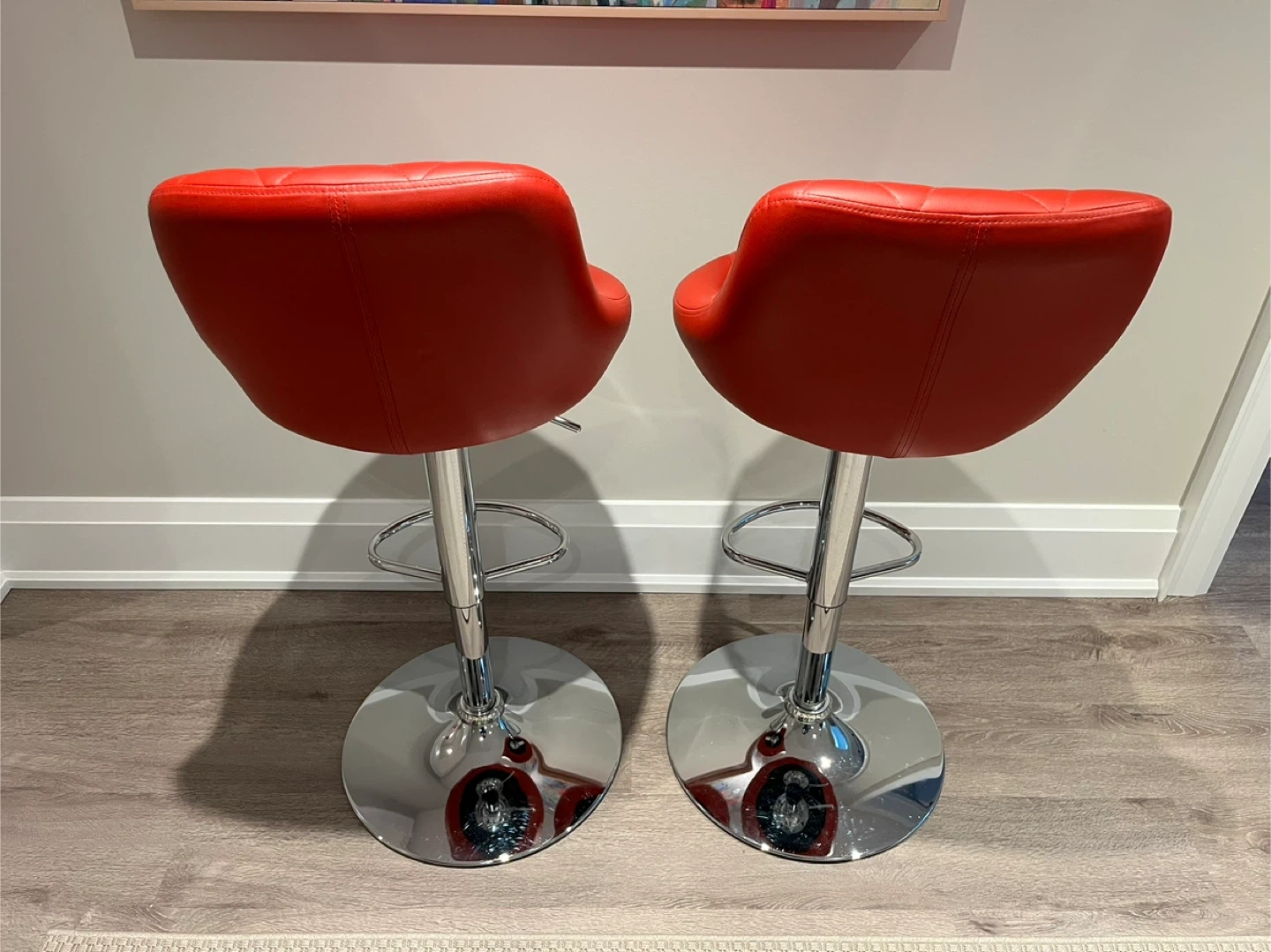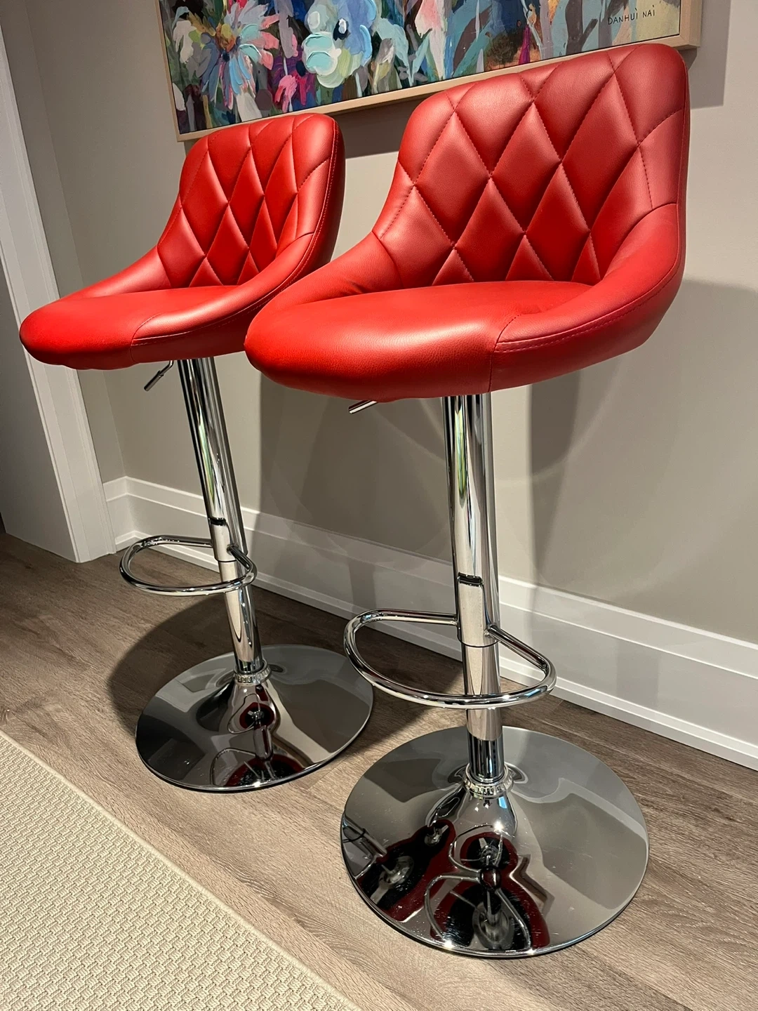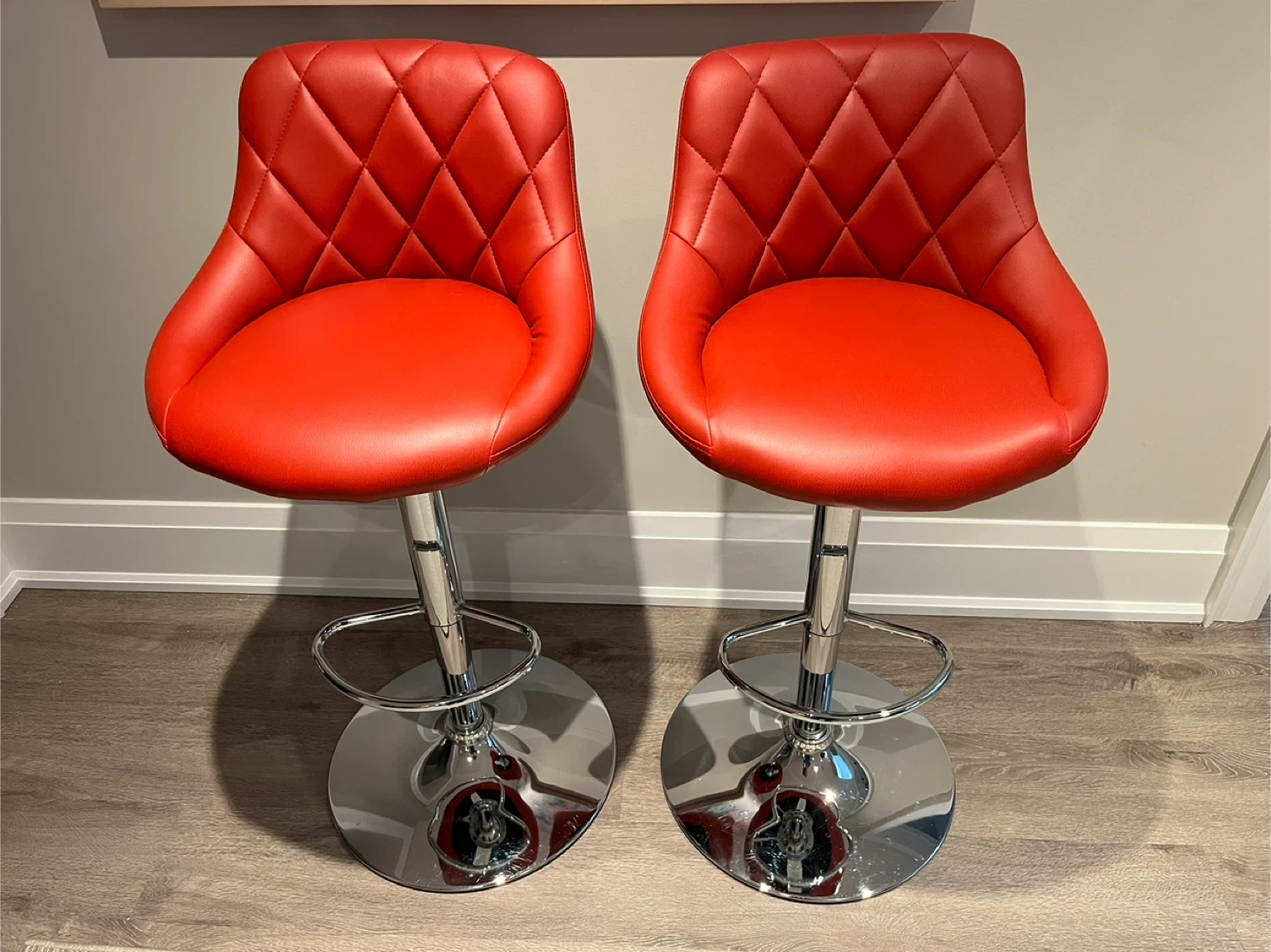 Stylish red bar stools with diamond-stitched backrests. They feature adjustable height and a chrome footrest. This set is great for a kitchen island or home bar!