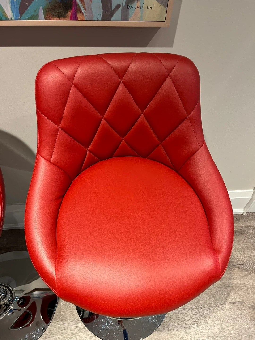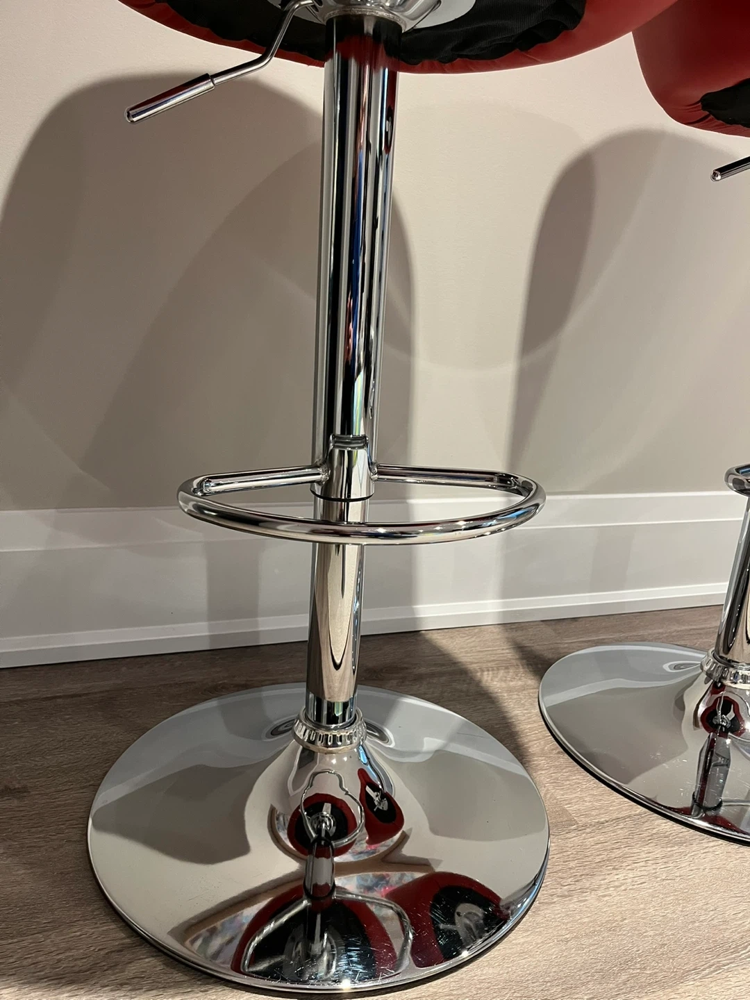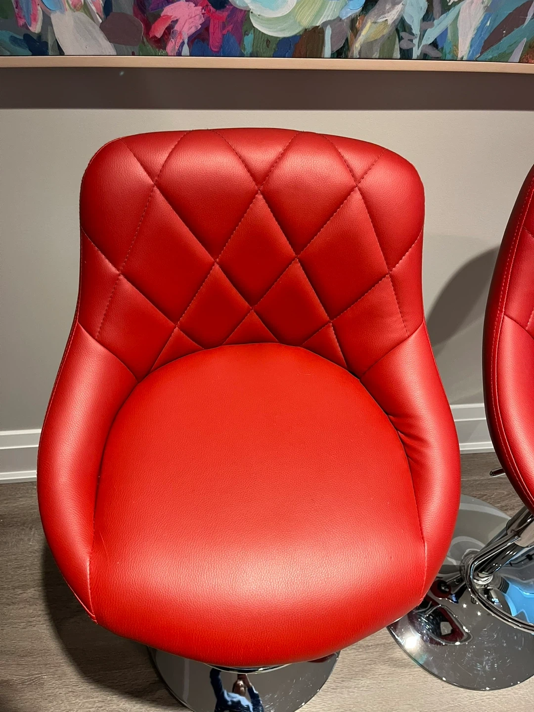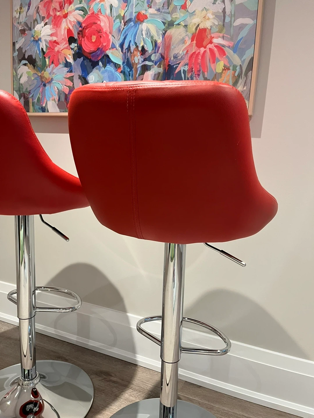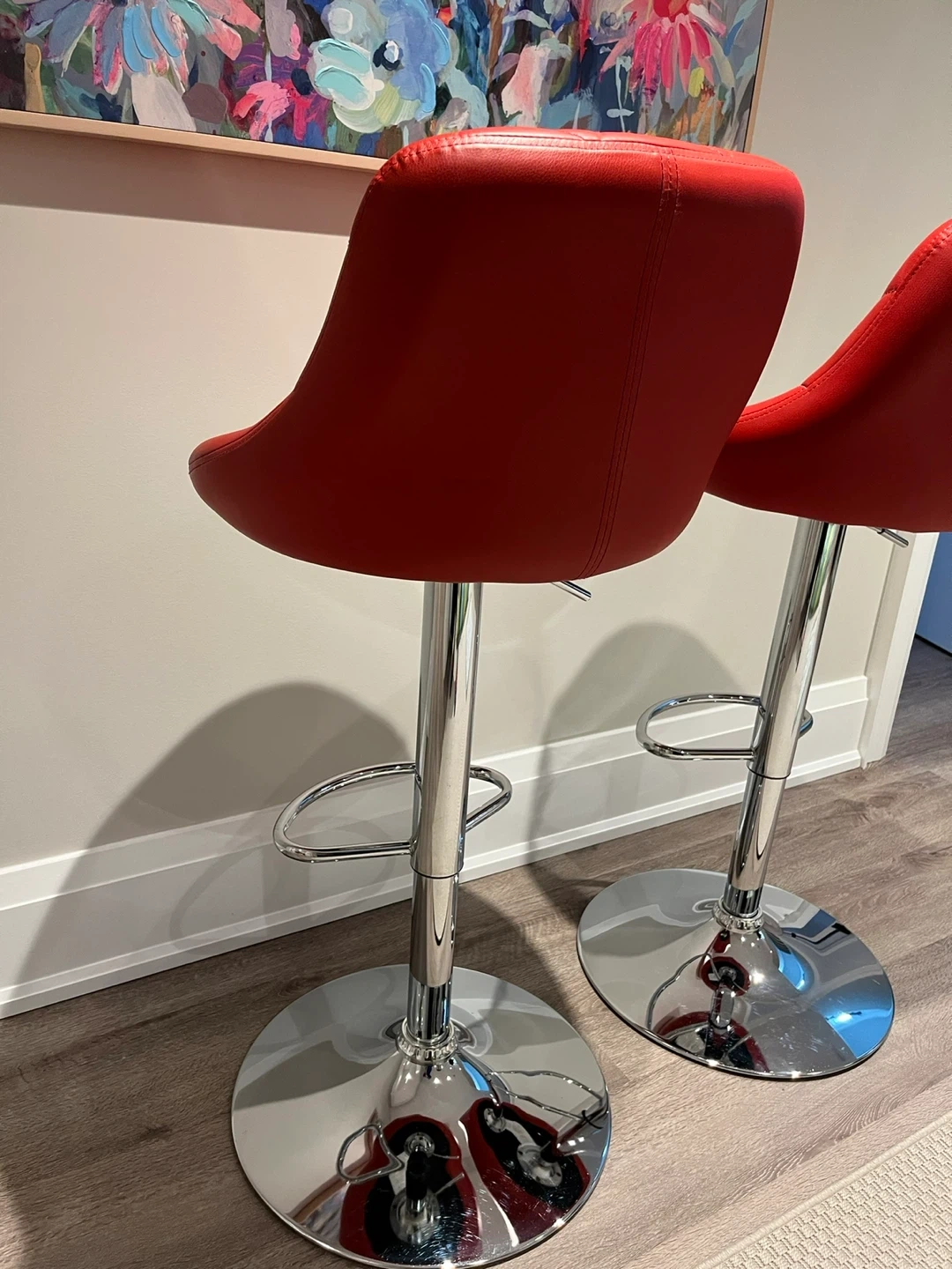 Stylish red bar stools with diamond-stitched backrests. They feature adjustable height and a chrome footrest. This set is great for a kitchen island or home bar!