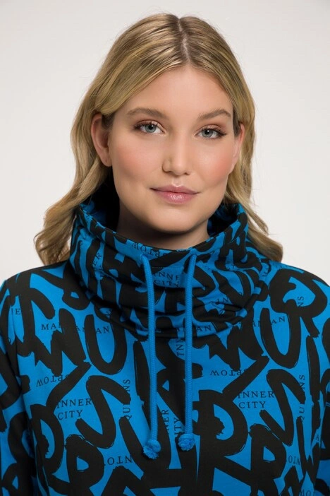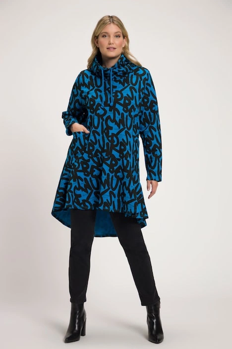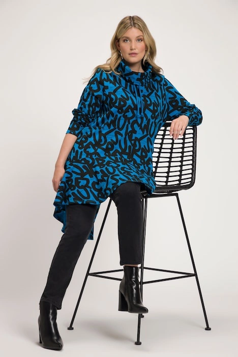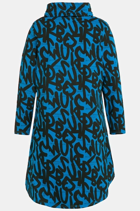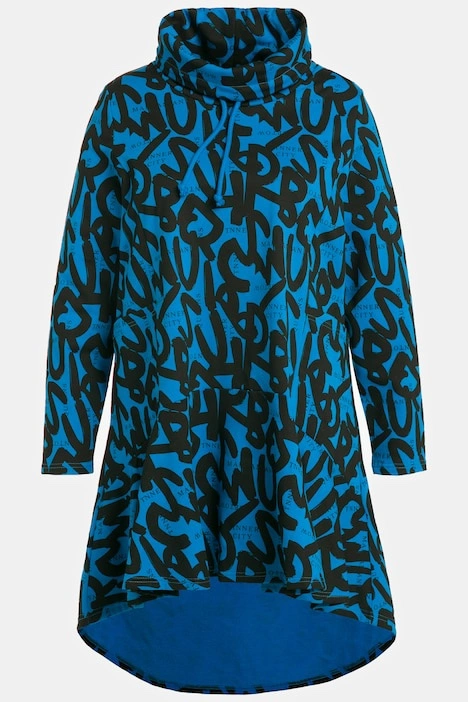 Letter Print Rounded Hi-Low Hem Tunic Sweatshirt - cozy up in your new go-to for effortless style. Adjustable tie turtleneck, front princess seams, long sleeves, patch pockets, rounded hi-low front ruffle, and extended length rounded back.