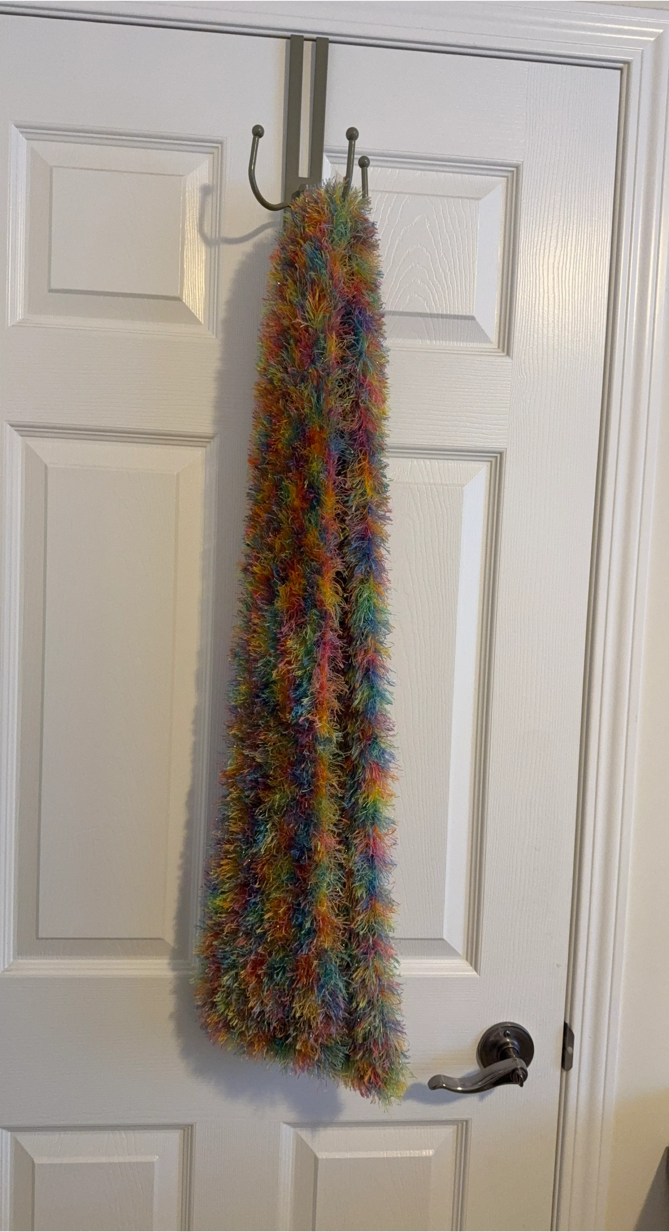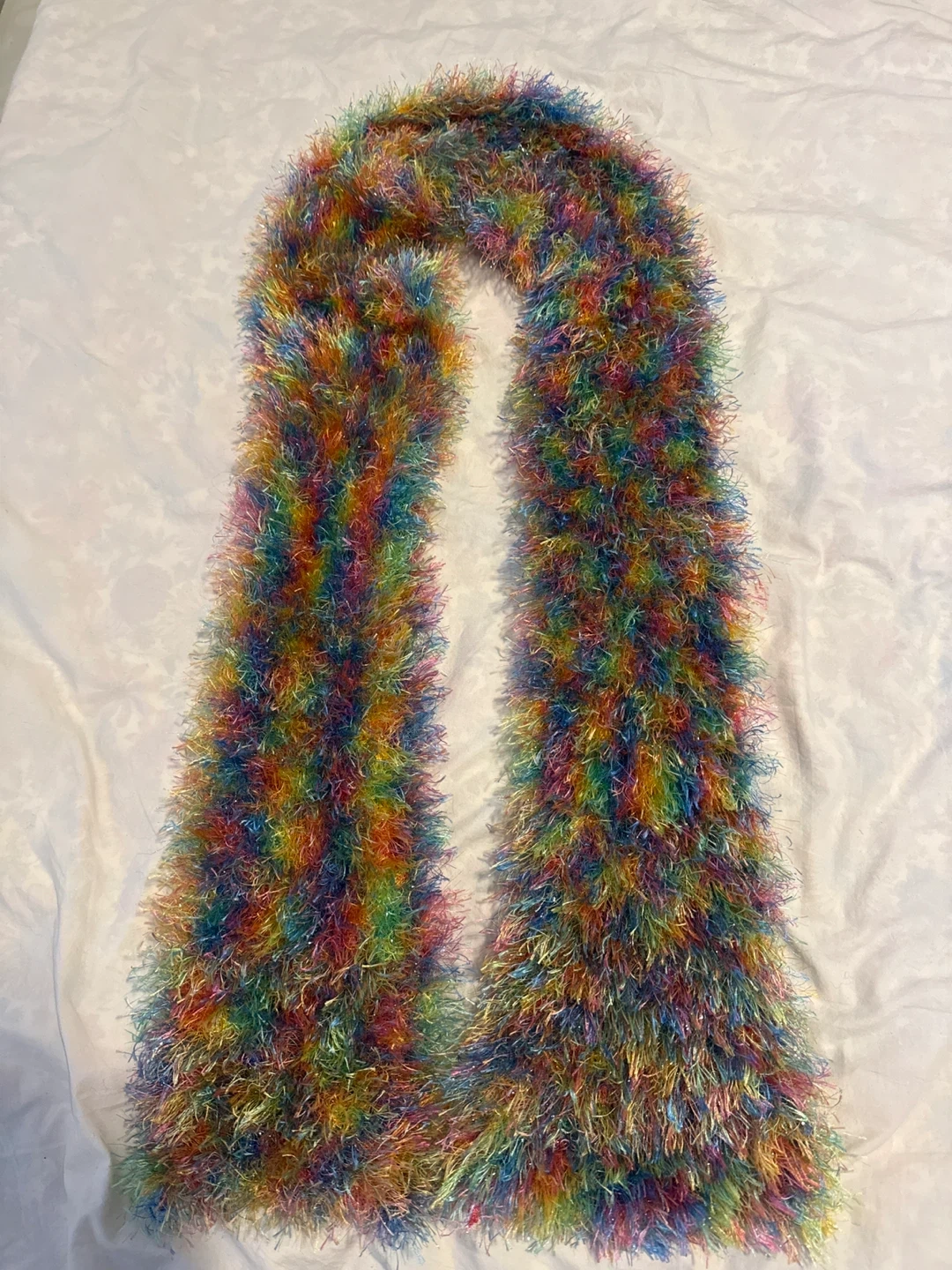 A super fun and fluffy scarf with a vibrant rainbow colourway. It's made from a soft faux fur material and has a lovely sparkly thread woven through it. This scarf adds a pop of colour to any outfit!
