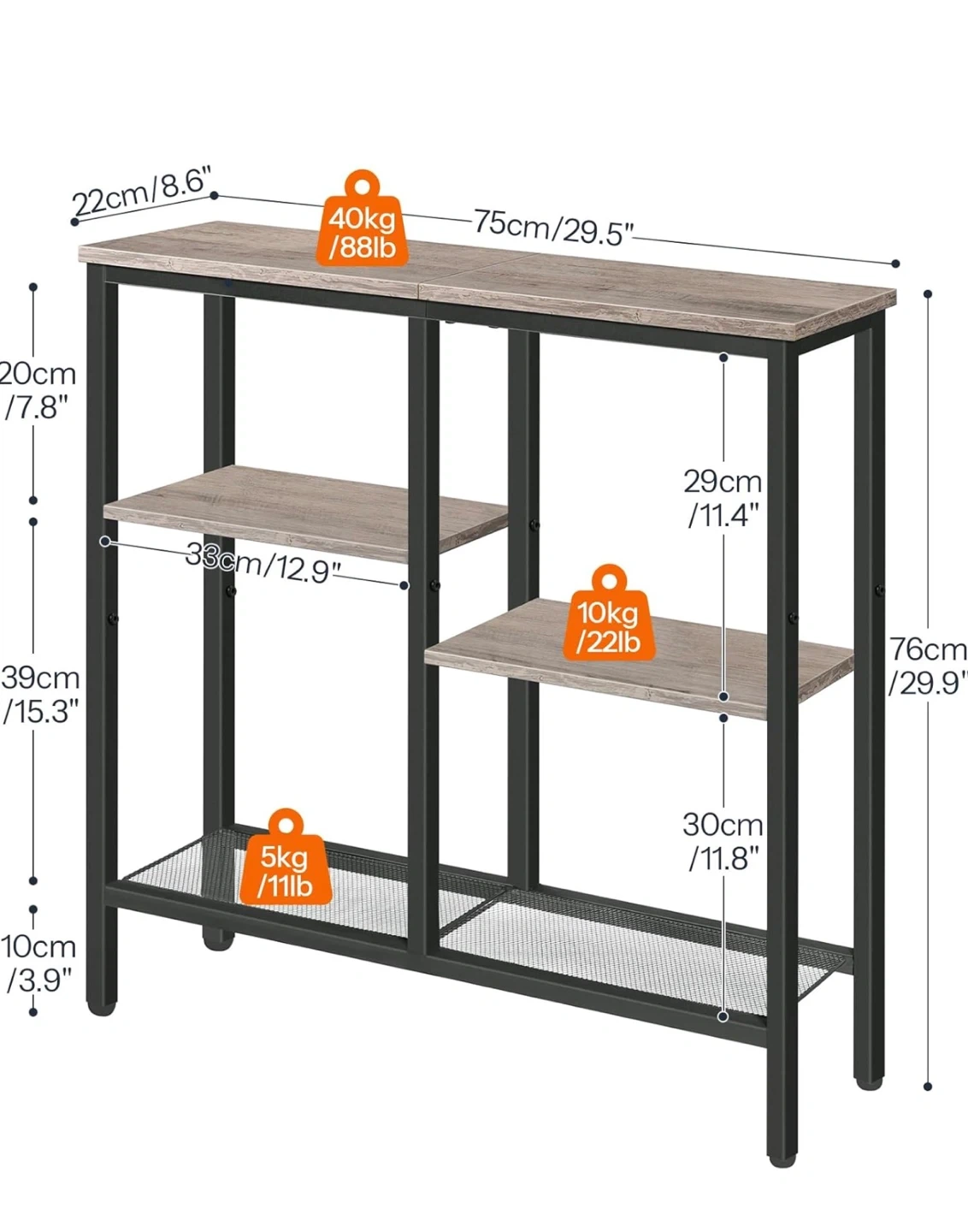 A rustic brown and black 3-tier console table. It's constructed with a wooden top and shelves, and a sturdy metal frame. The top shelf supports up to 40kg/88lb, the middle shelf up to 10kg/22lb, and the bottom shelf up to 5kg/11lb. This table is great for entryways or living spaces.