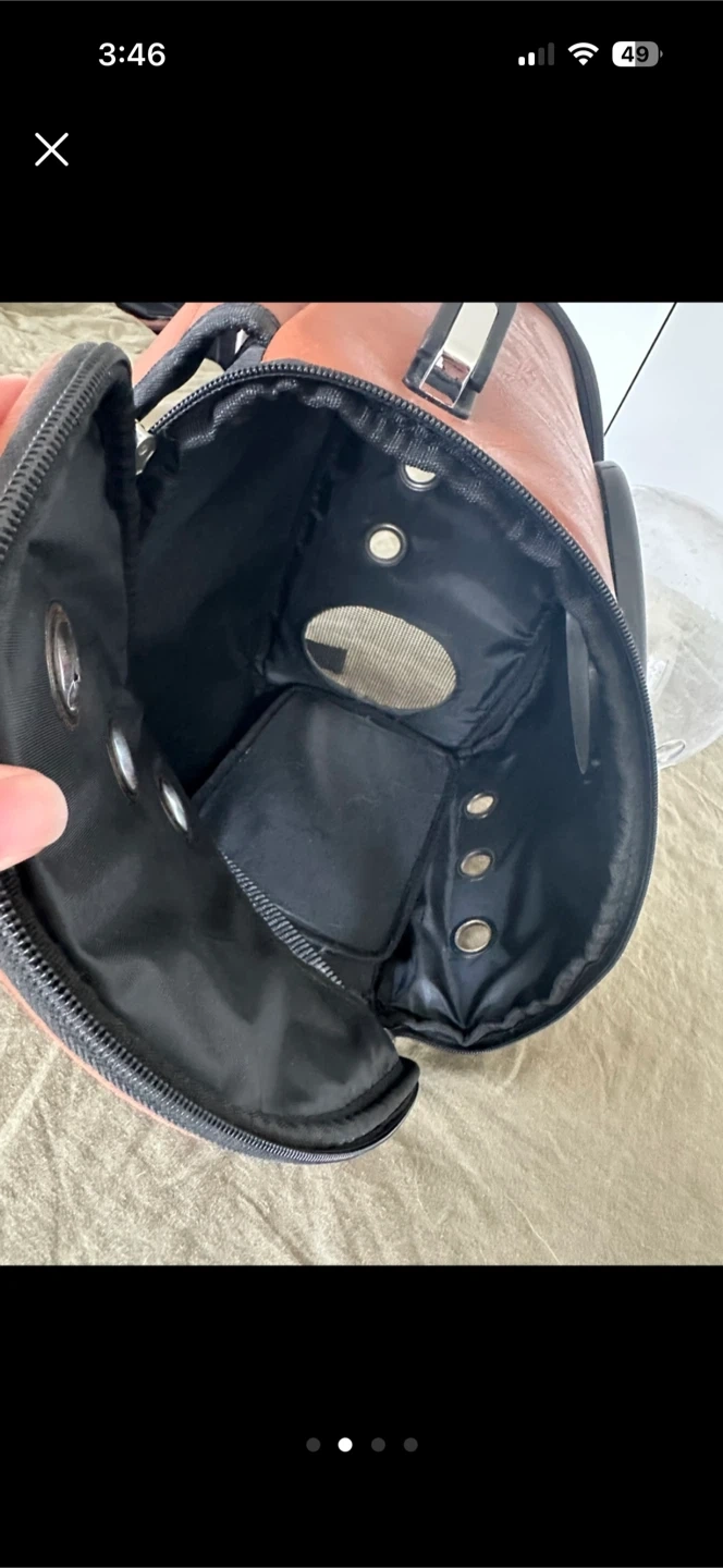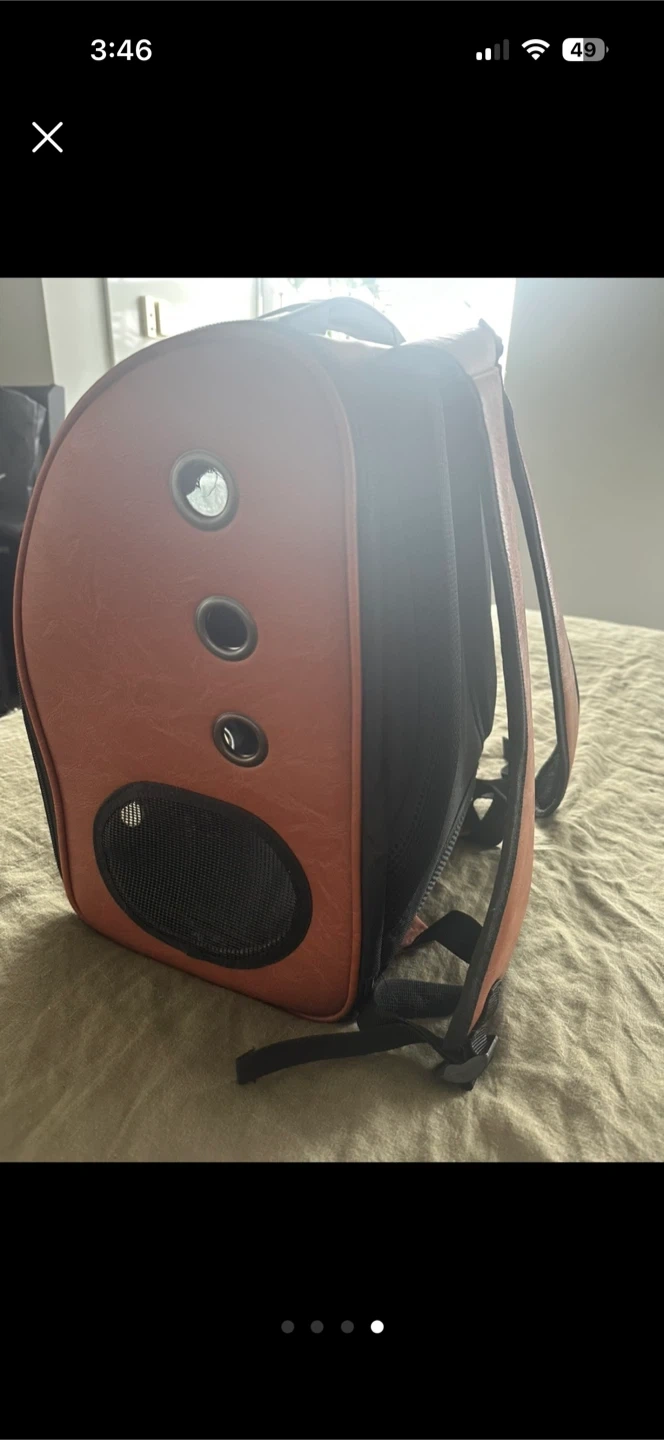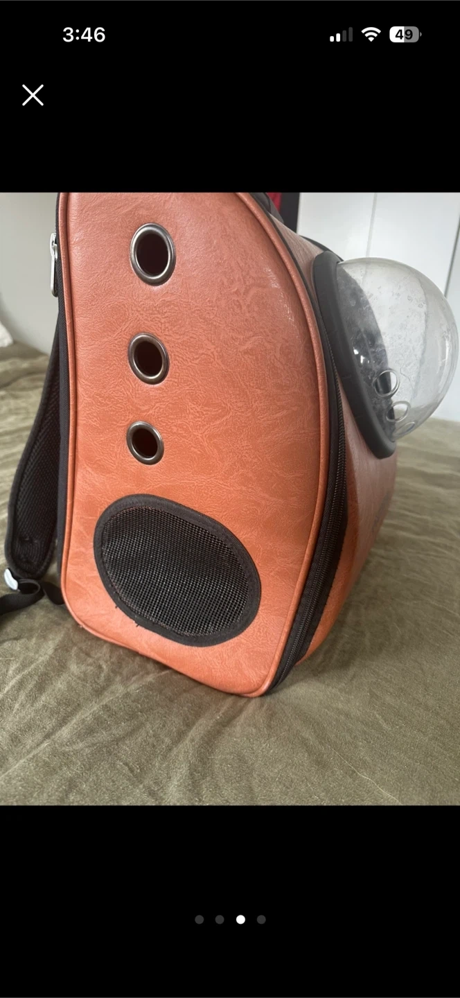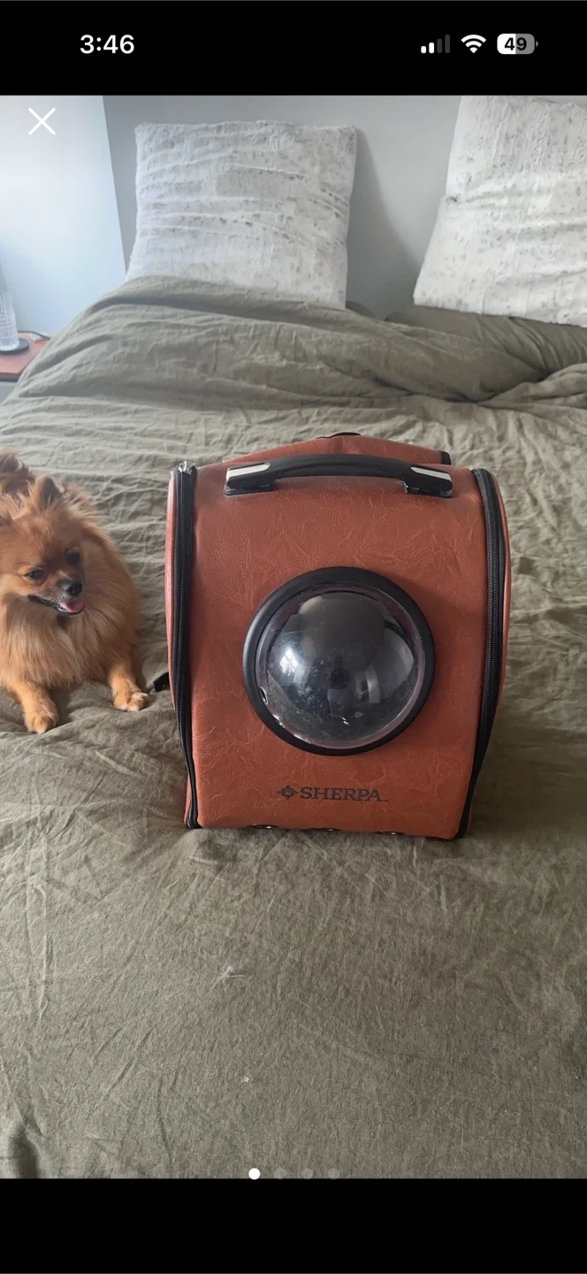 This is a Sherpa pet carrier backpack. It's a brown faux leather design with a clear bubble window. Features include mesh vents and an interior pad. Made for small pets!