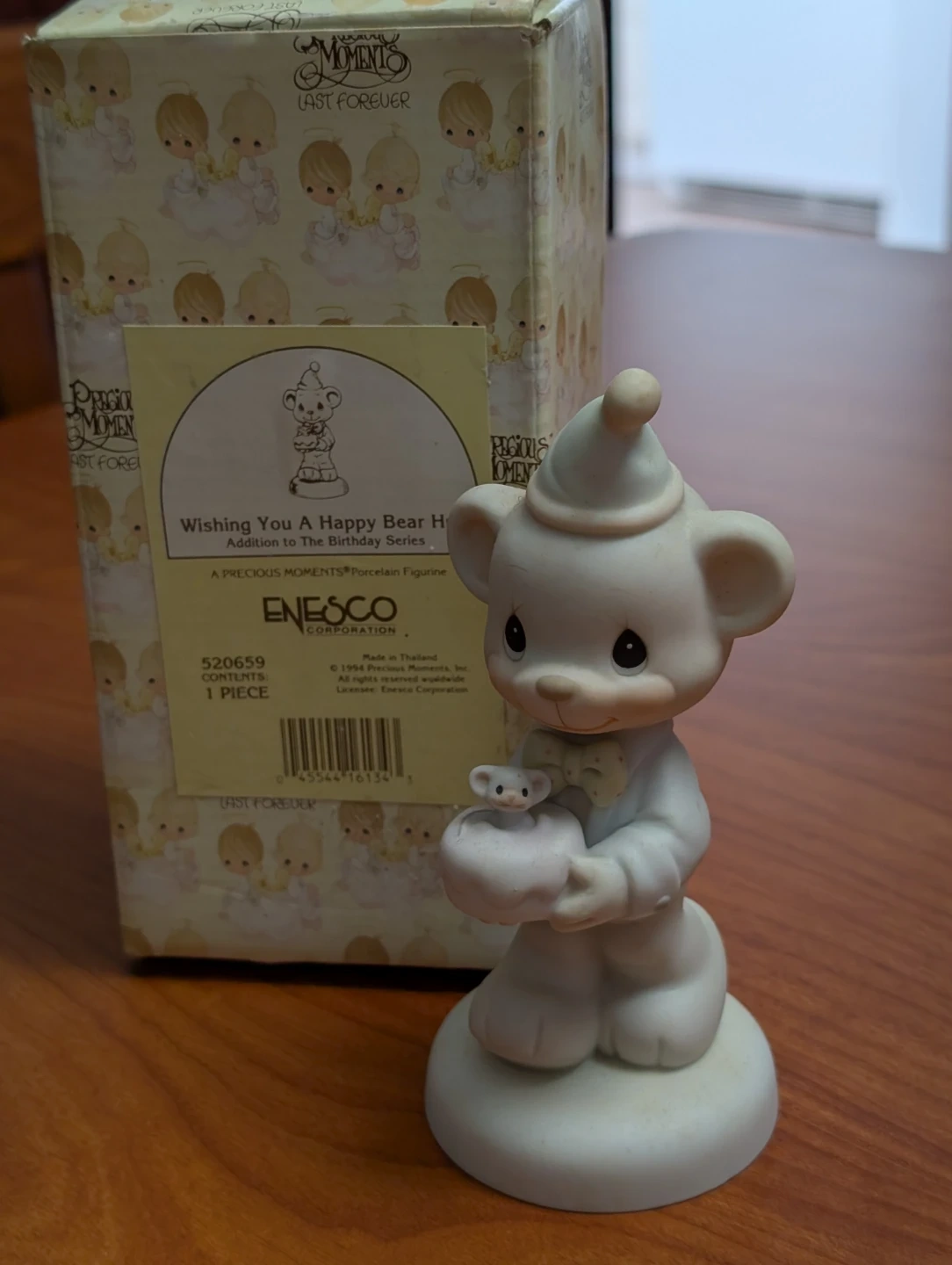 Precious Moments porcelain figurine "Wishing You A Happy Bear Hug". This piece is from the Birthday Series and was made in Thailand. It's a single piece included in the original box.
