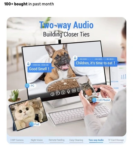 • TF card support up to 128GB (not included) – Store video clips and photos locally so you can review what your pet did while you were out.