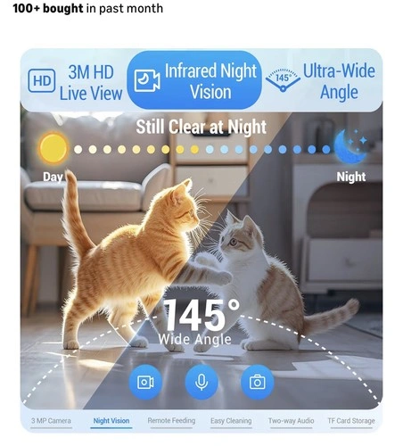 • Infrared night vision & 145° wide angle – Clear video even in low light, with a wide view of the feeding area.