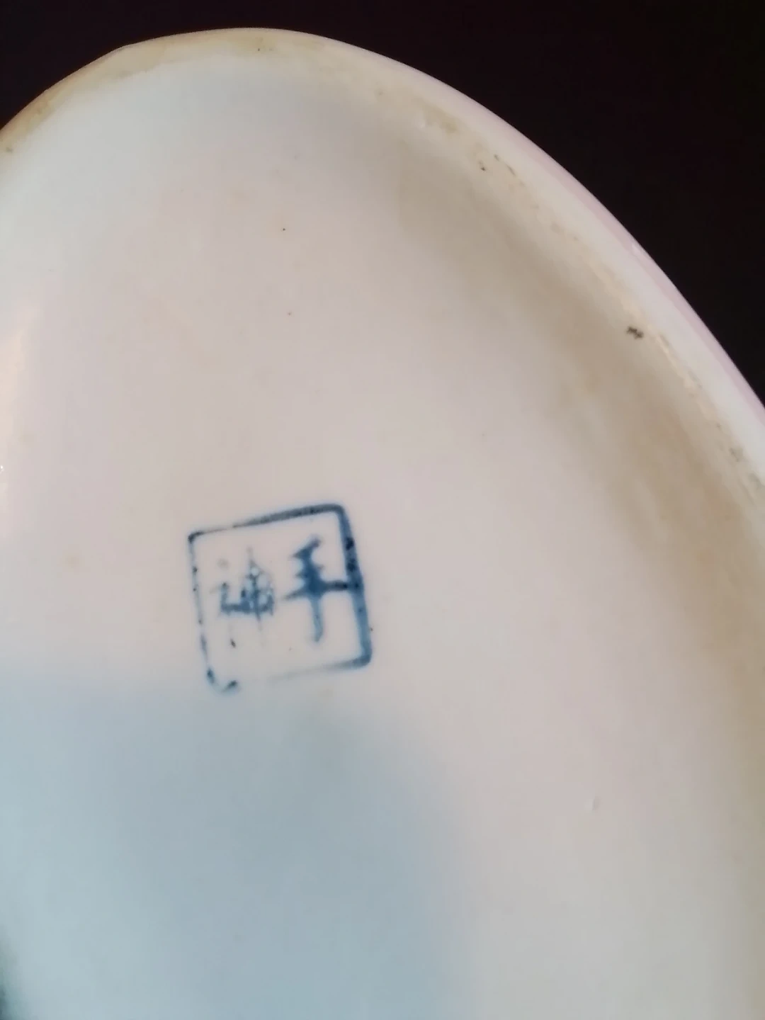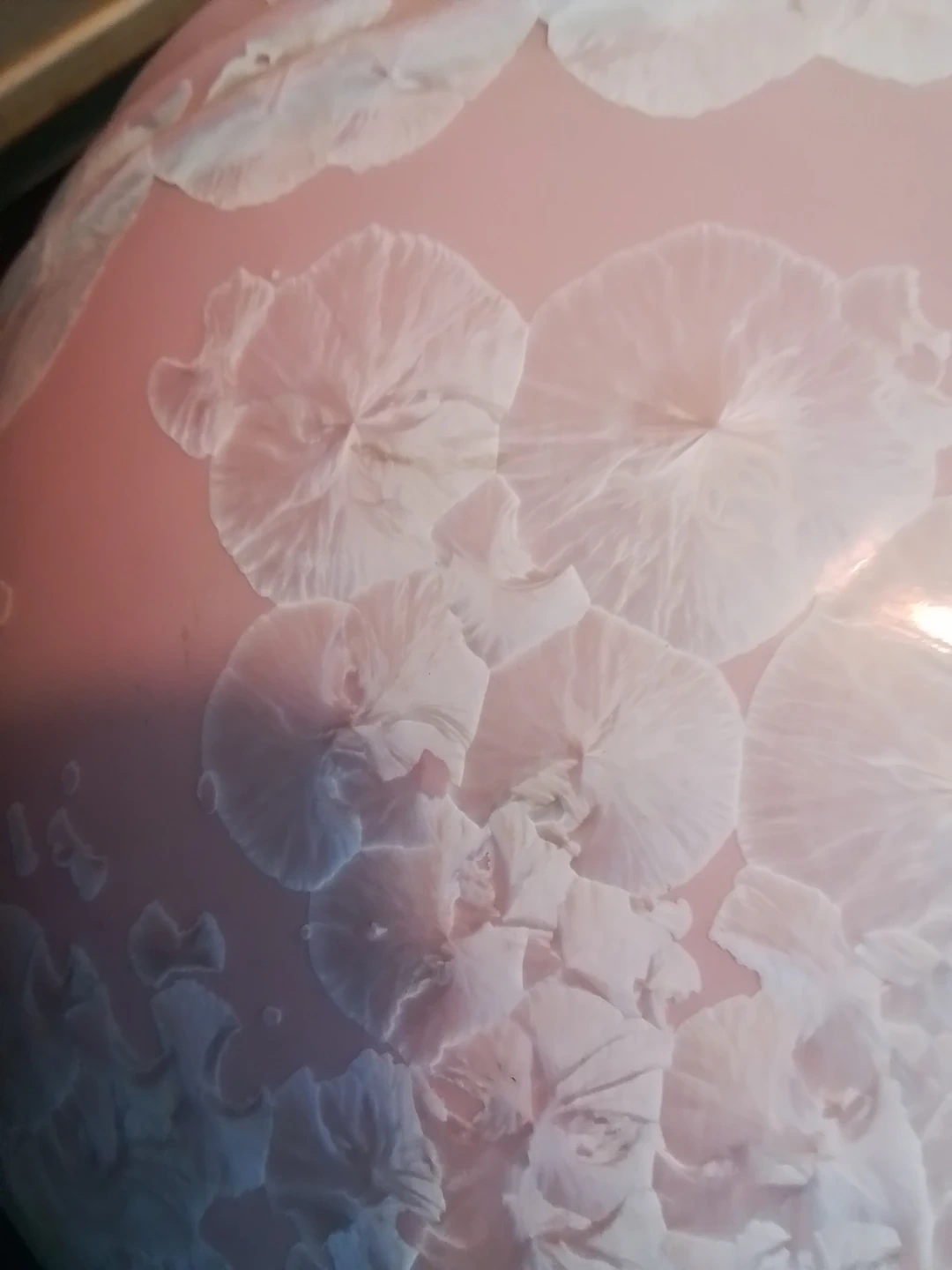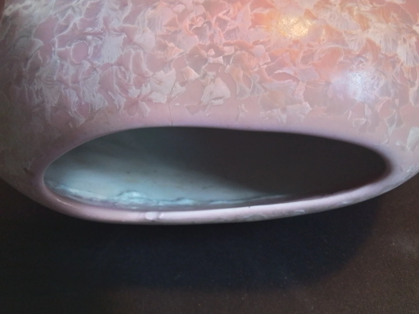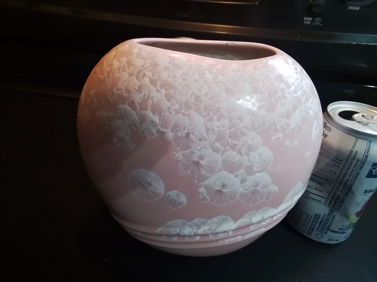 This is a used vintage Chinese pink crystalline glazed ceramic vase, standing at approximately 7.5 inches in diameter and 7 inches in height. The vase features a delicate pink hue complemented by unique crystalline patterns across its surface. It is signed on the bottom with a Chinese character mark, adding to its authenticity and collectibility.