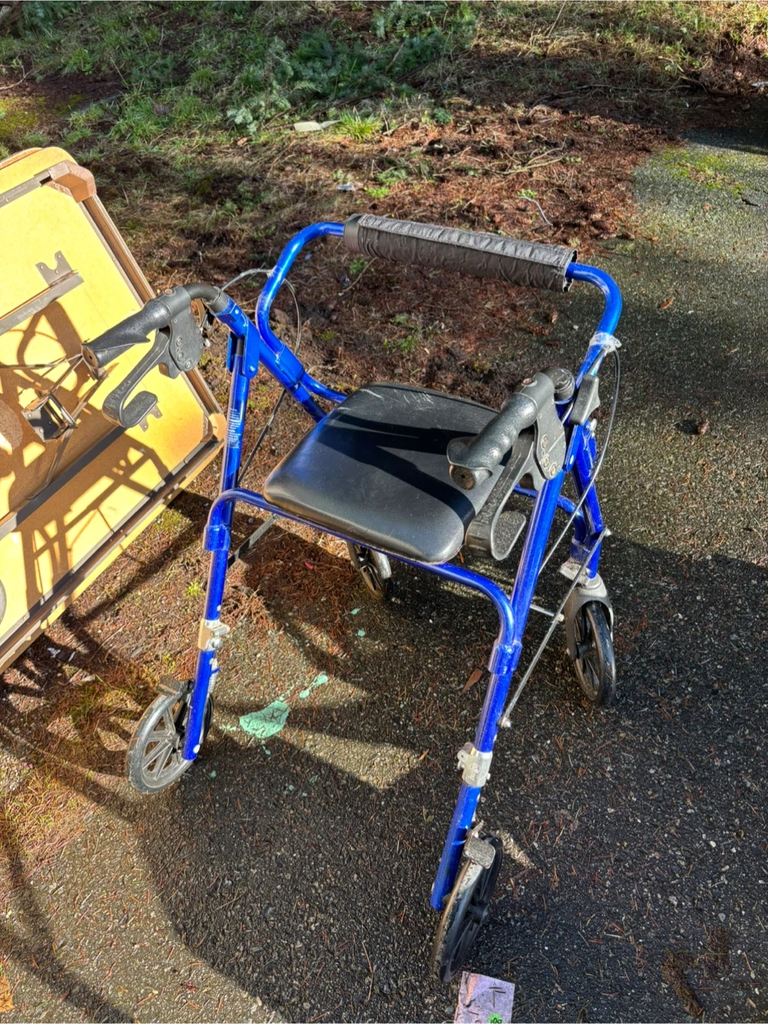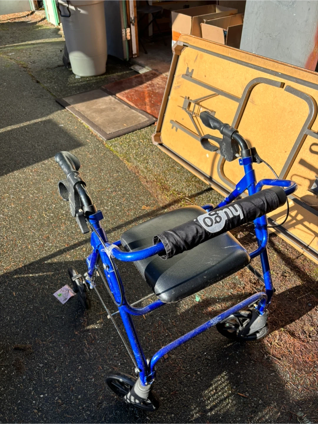 Selling a Hugo rollator walker in blue. It's in good condition and ready to assist someone who needs a little extra support. Features include a comfortable seat and easy-to-use hand brakes for safety and convenience
