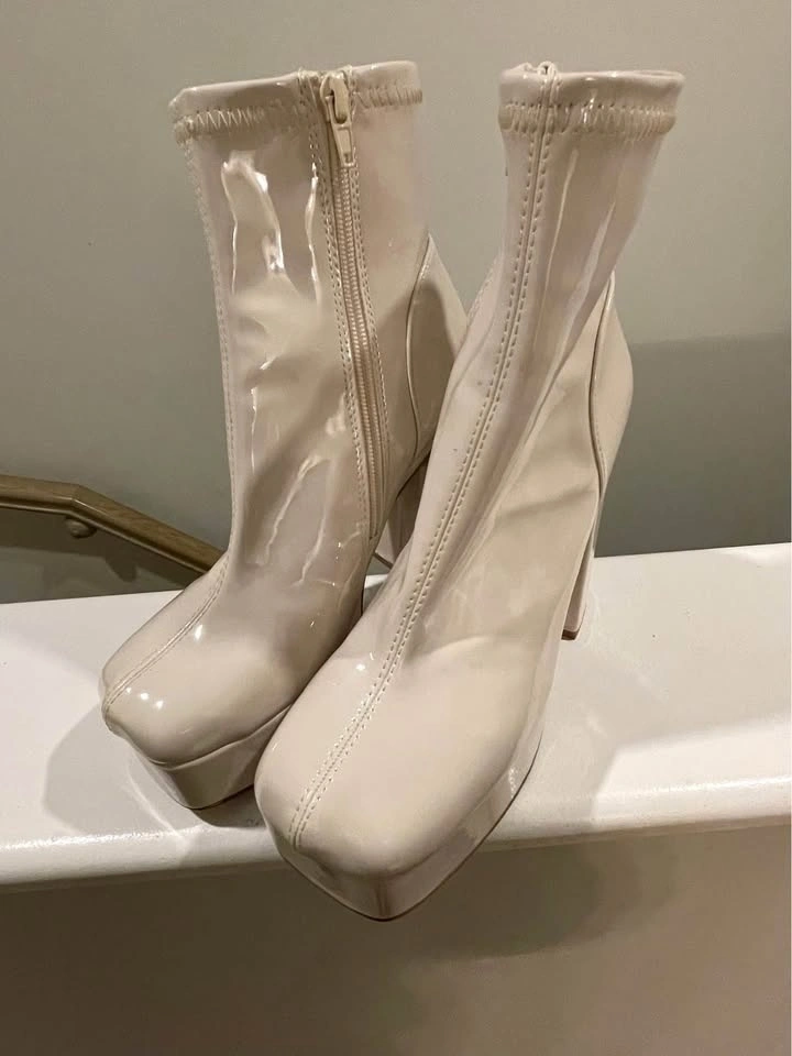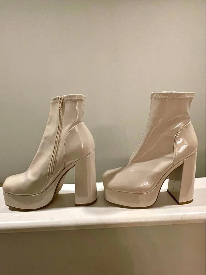 Chic ivory ankle boots with a chunky block heel and platform sole.