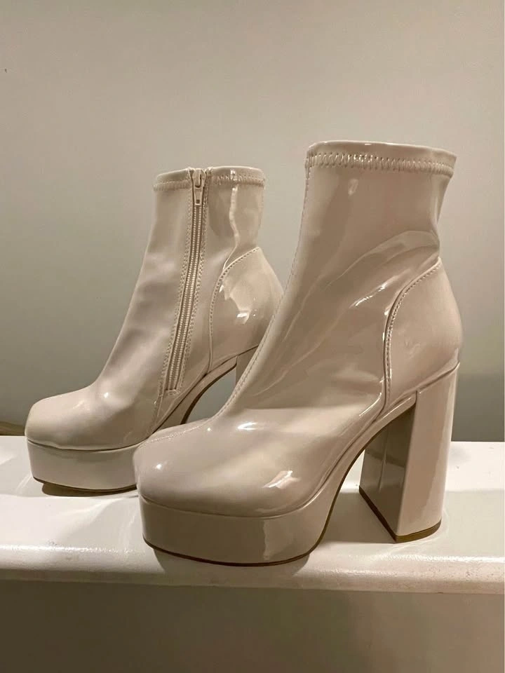 Chic ivory ankle boots with a chunky block heel and platform sole.