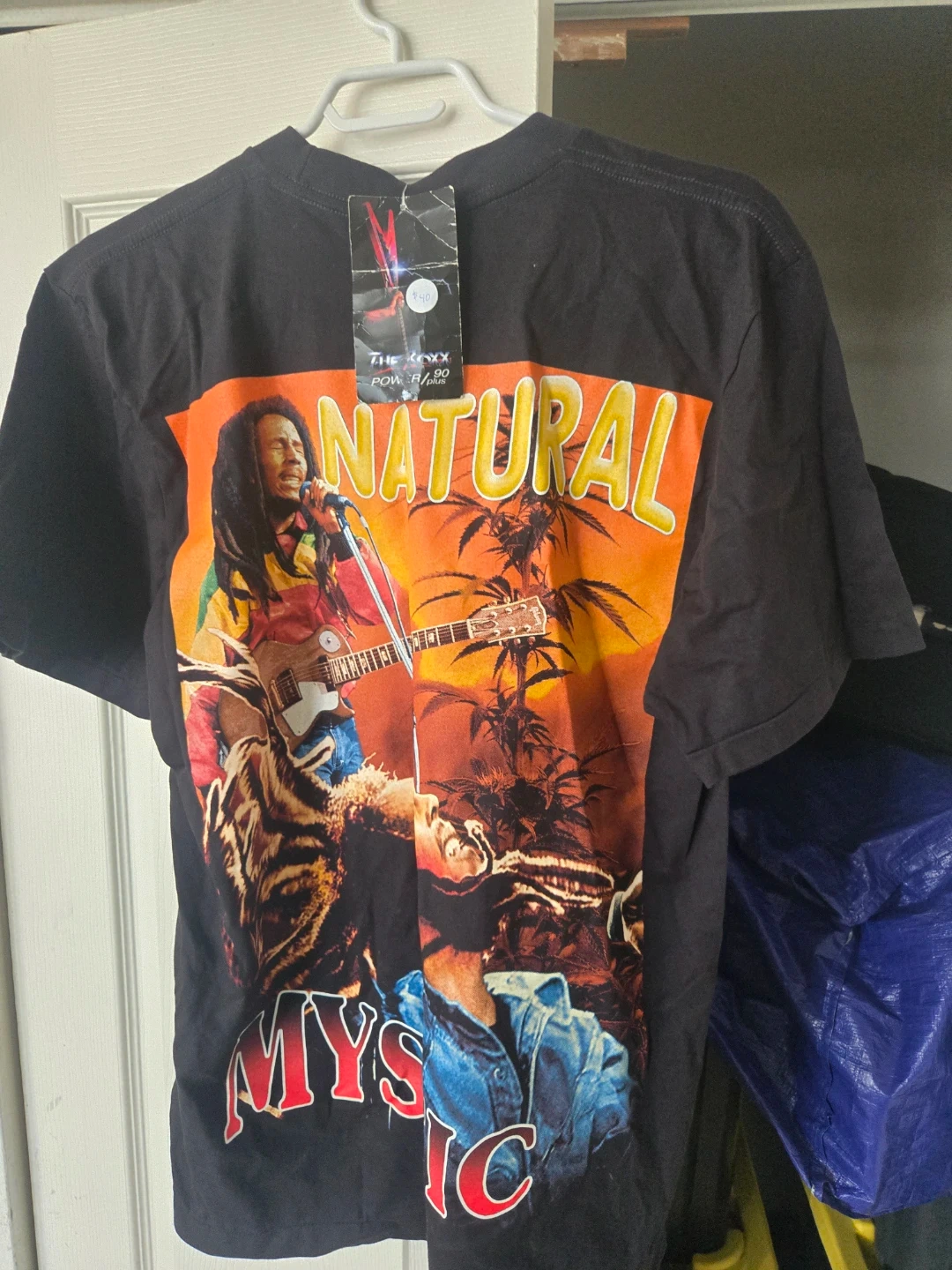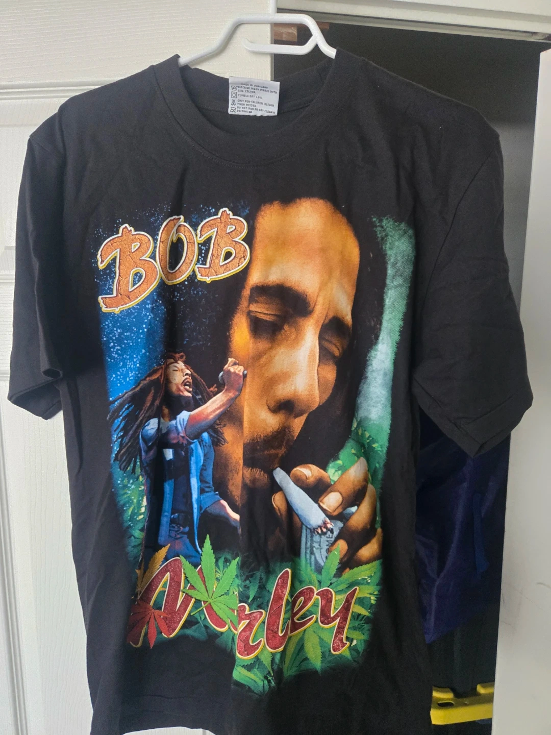 Black t-shirt featuring a graphic print of Bob Marley. This shirt is made of cotton. It's a great piece for fans of reggae music and its iconic artist.