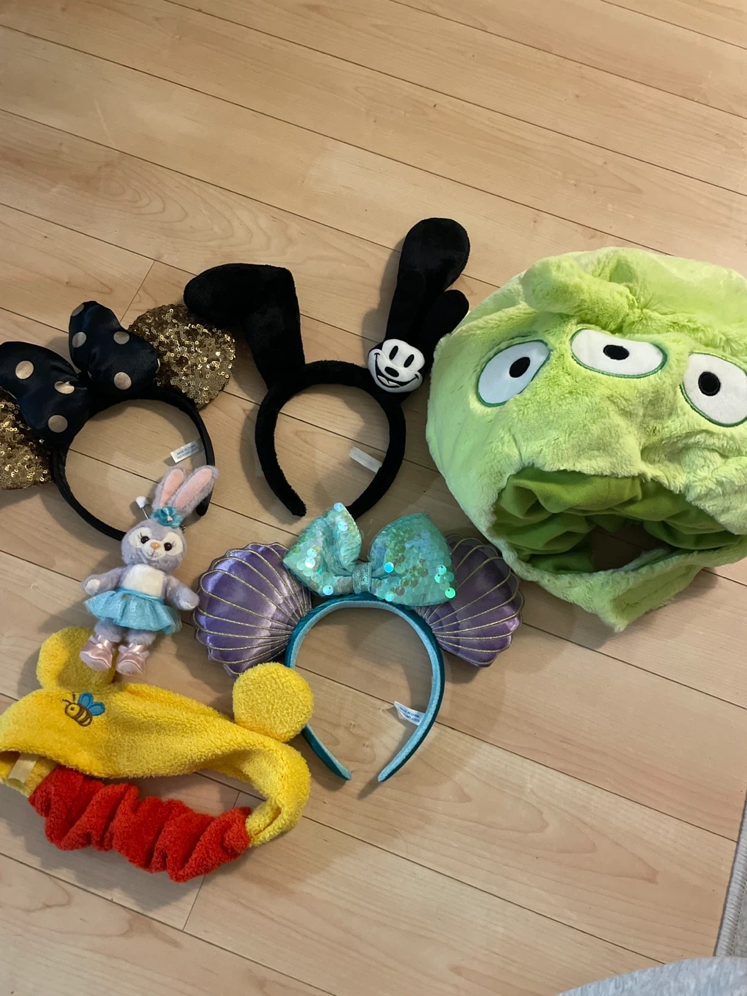This bundle includes a variety of Disney character-themed headbands and a small StellaLou plush toy. You'll find headbands with Minnie Mouse ears, Oswald the Lucky Rabbit ears, and a mermaid-inspired Ariel design. Also included is a Pooh Bear-themed hat. Perfect for Disney fans and park visits!