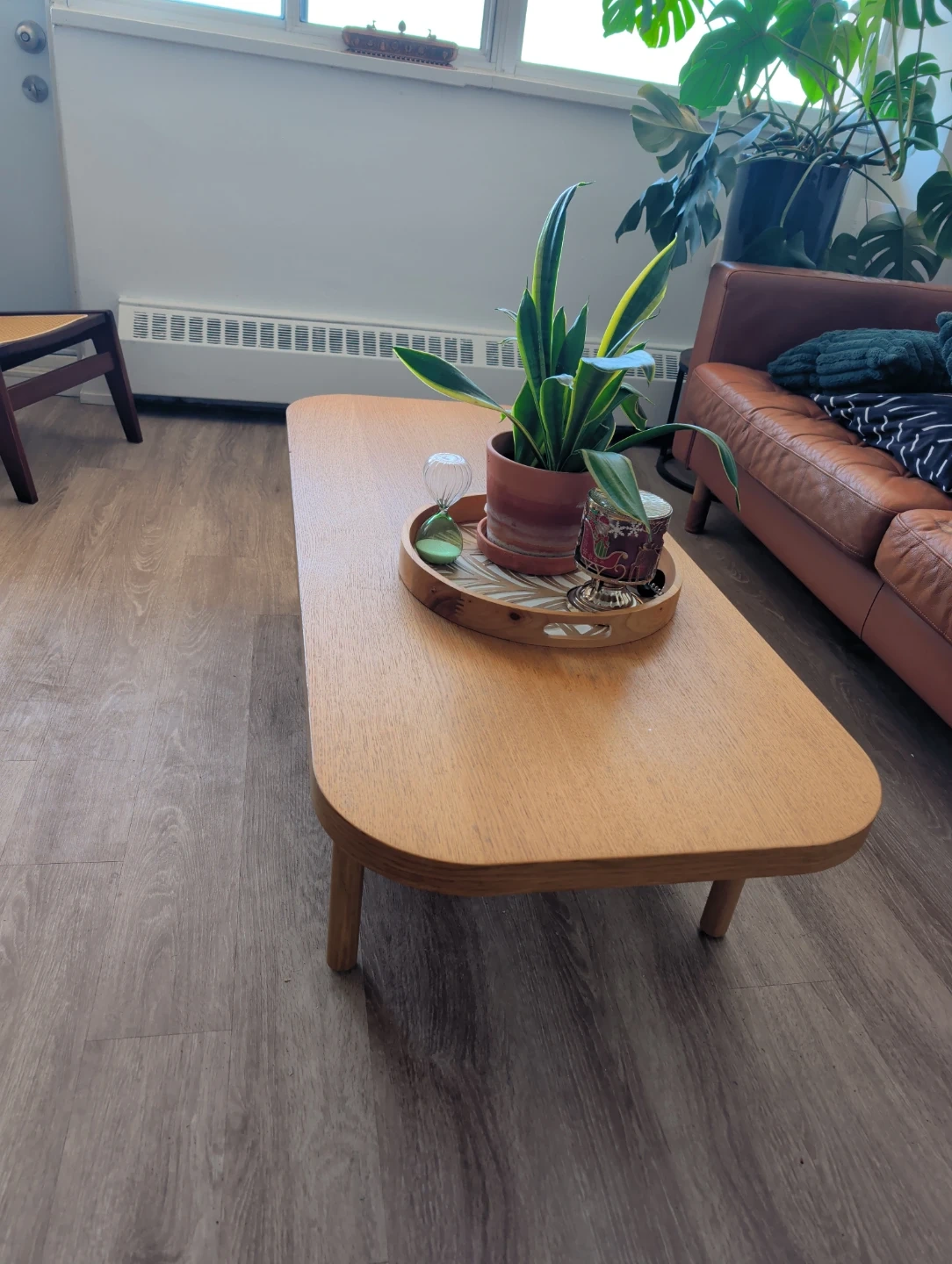 A simple wooden coffee table featuring a convenient lower shelf for storage. Its natural wood finish complements various decor styles. This table's compact size makes it suitable for smaller living spaces.