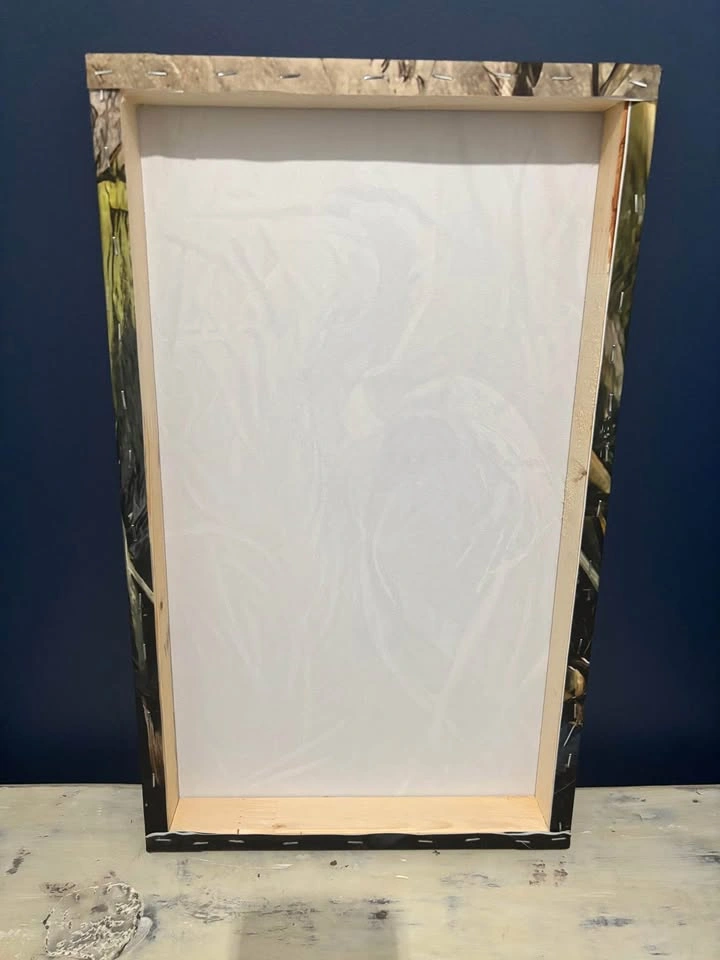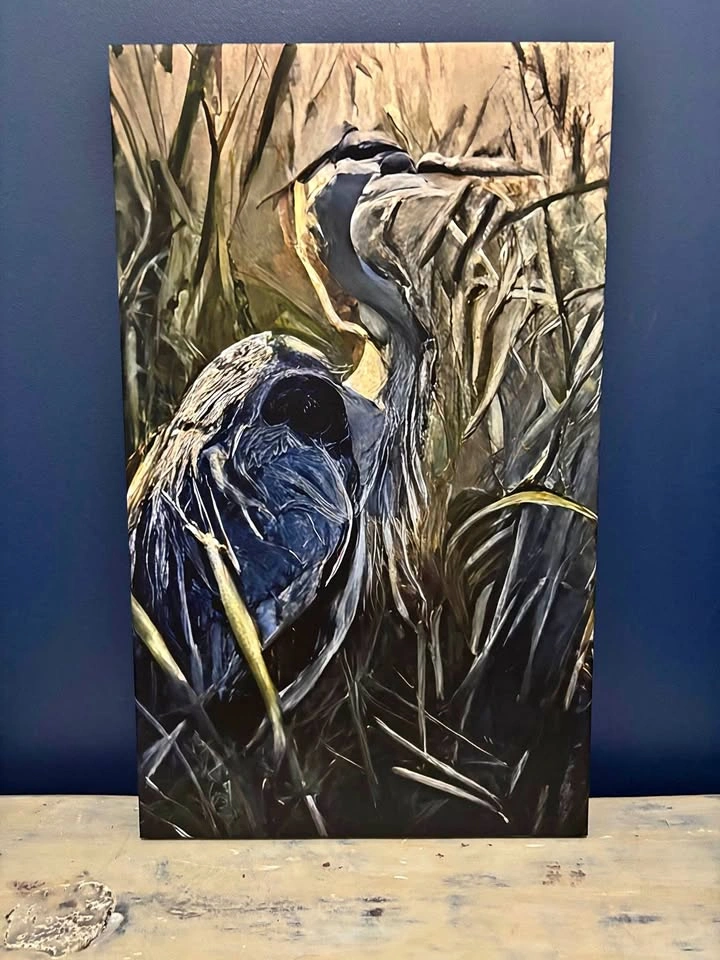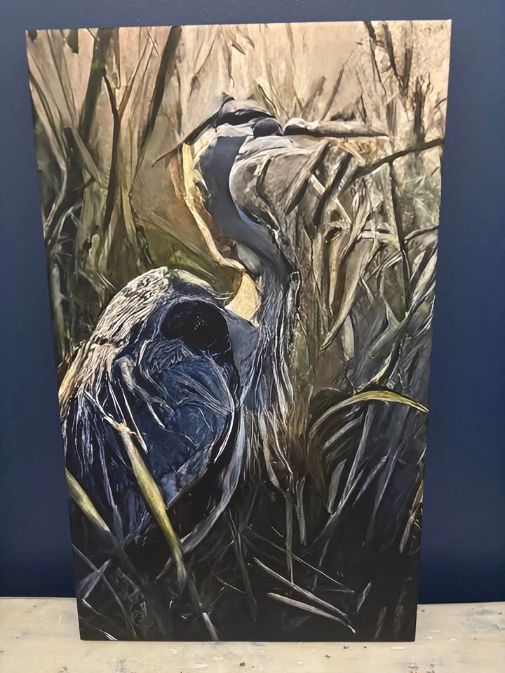 Beautiful blue heron print on canvas. Framed onto 19.6”X11.7”X1.5” wooden frame. Light weight and ready to hang with sawtooth hanger attached.
