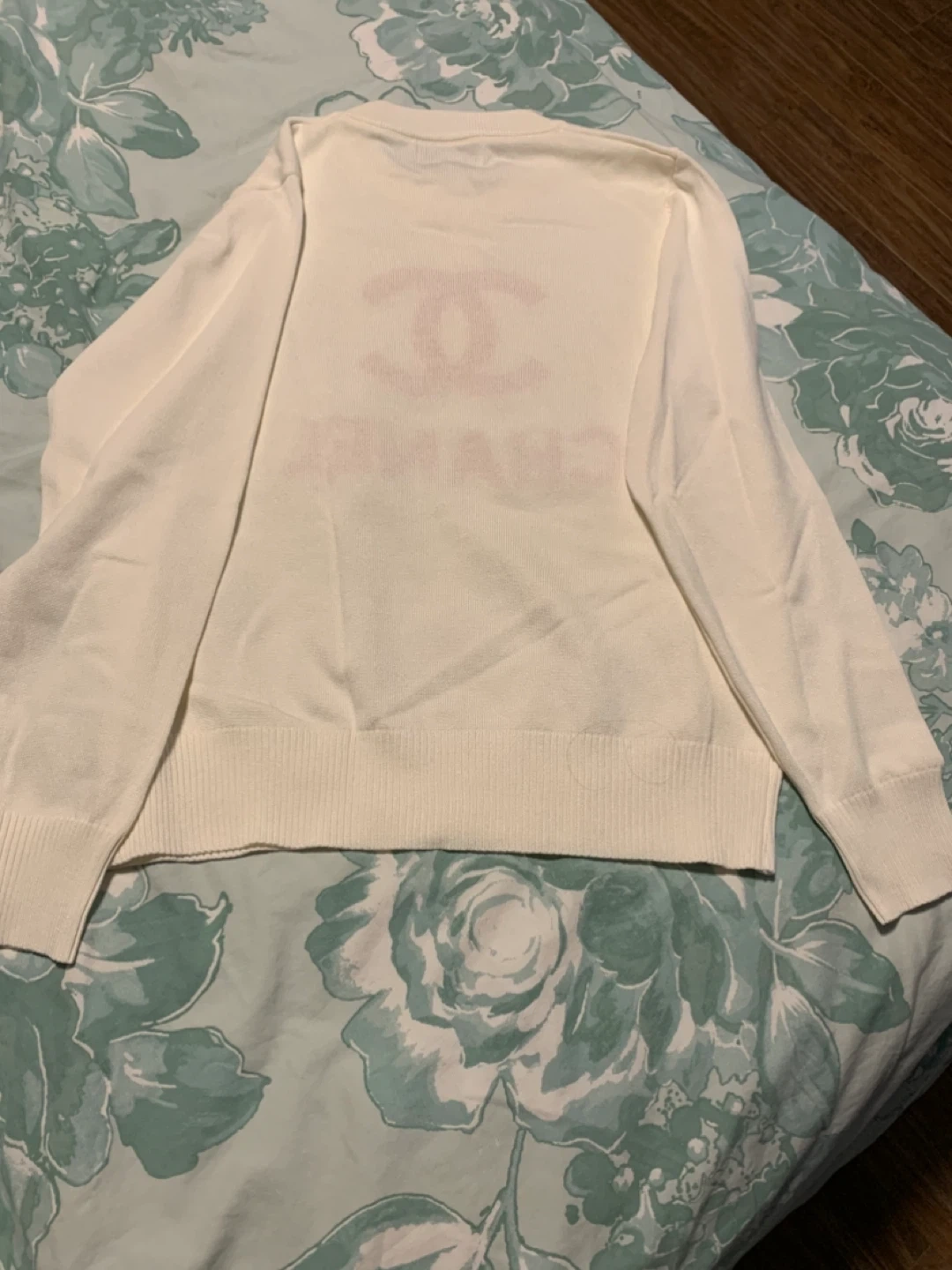This is a Chanel long-sleeve crewneck sweater in white with a pink logo. It appears to be a size medium. Made from a comfortable knit material. One size but doesn’t fit xl