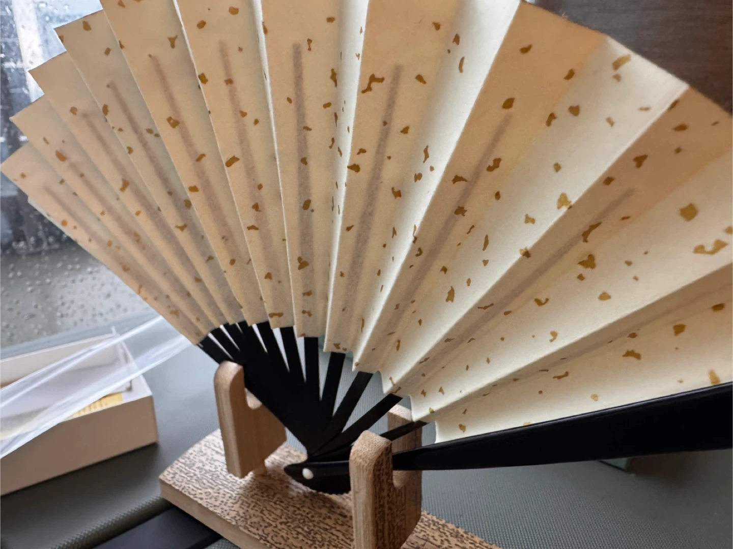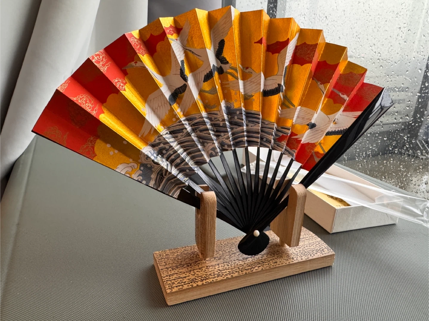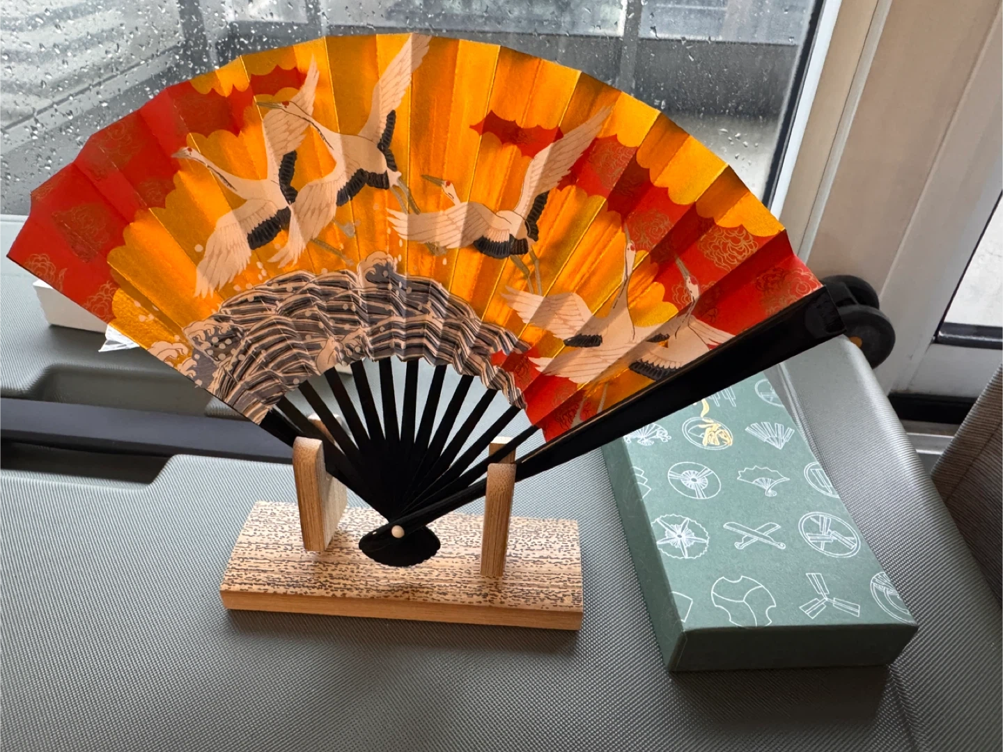 Decorative folding fan featuring a Japanese crane design. Includes a wooden stand and comes in a gift box. Brought from Japan.
