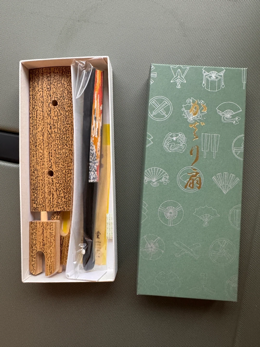 Decorative folding fan featuring a Japanese crane design. Includes a wooden stand and comes in a gift box. Brought from Japan.