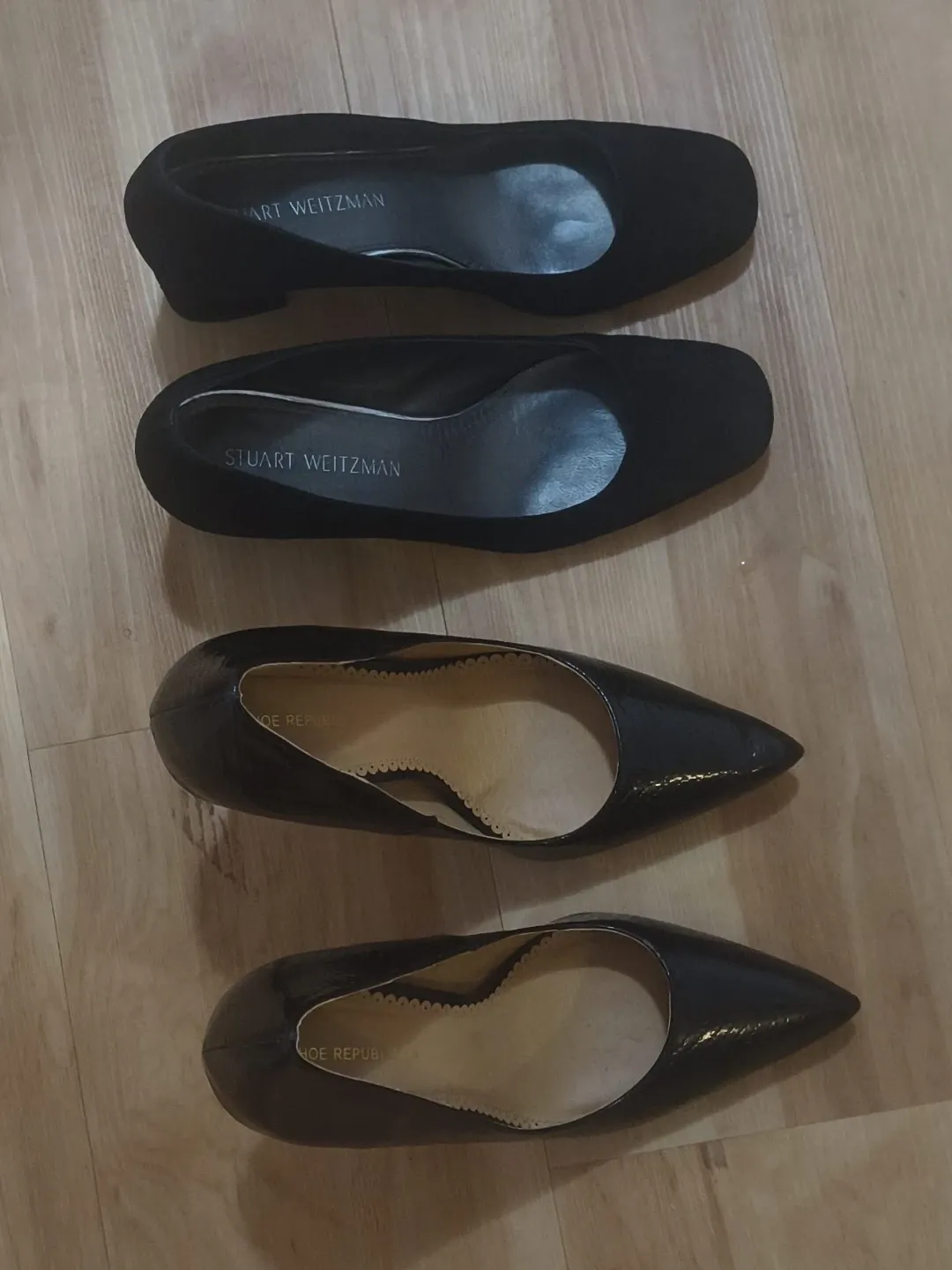 Two pairs of black heels. One pair is Stuart Weitzman in suede. The other pair is Shoe Republic in patent leather. Both are women's dress shoes.
