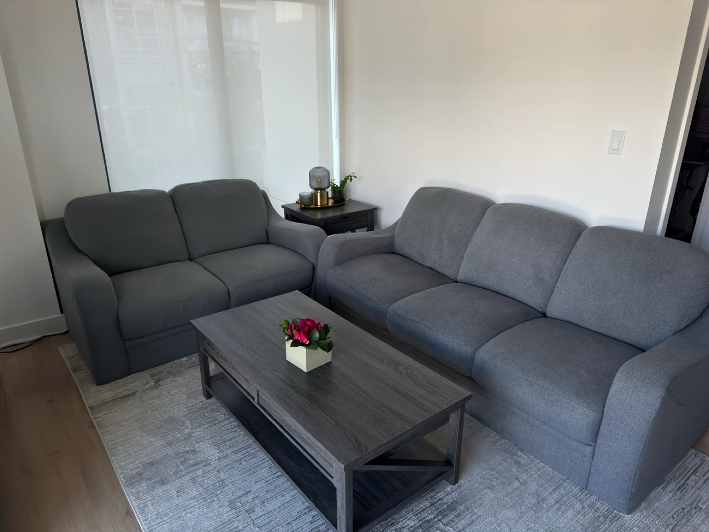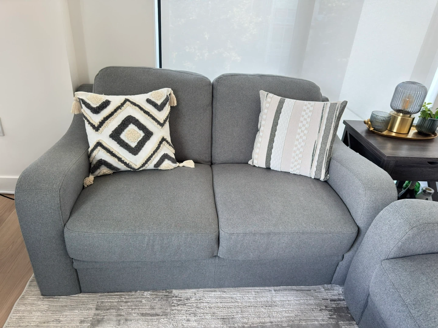 Comfortable two-seater loveseat and three-seater sofa in a soft grey fabric. Perfect for a living room or den! Both pieces have clean lines and a modern look.