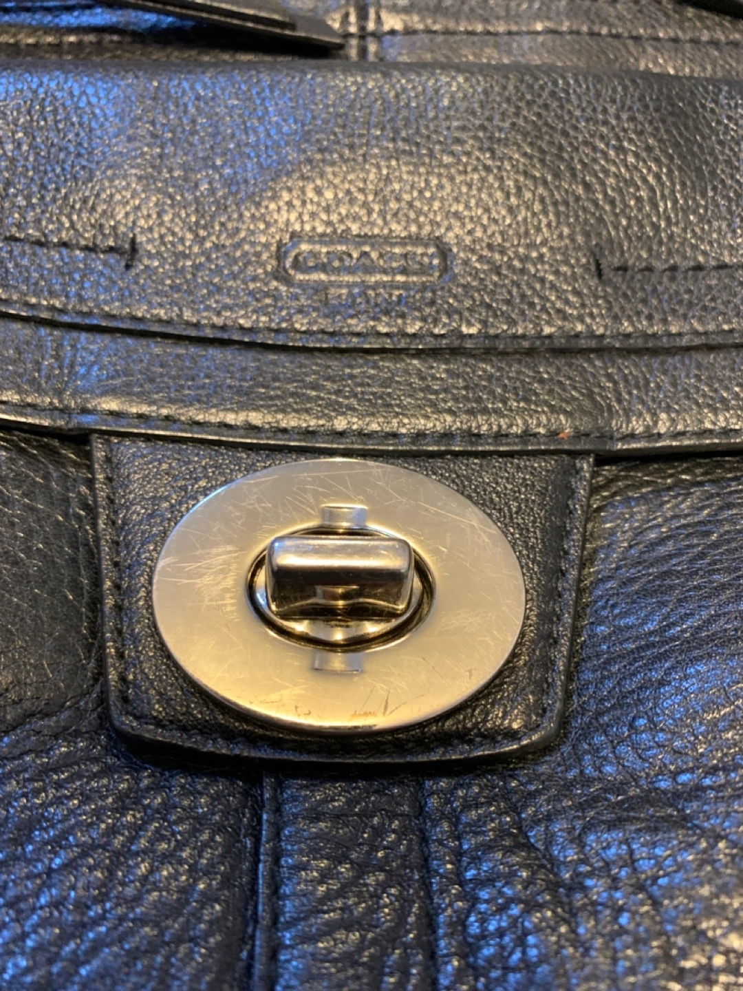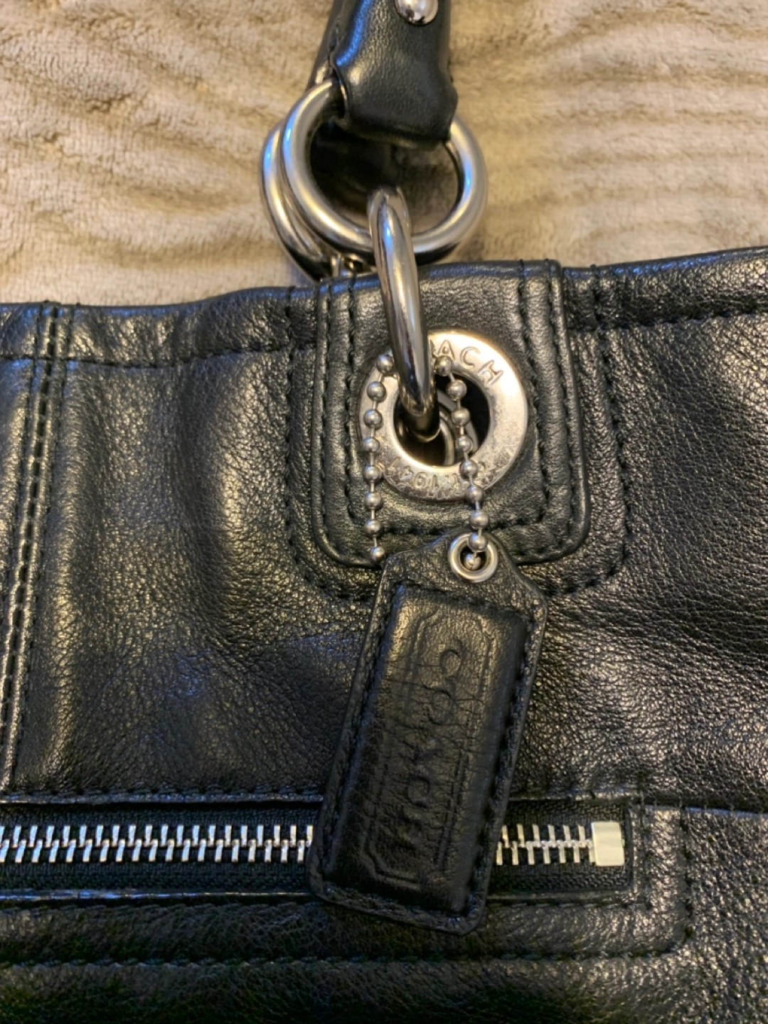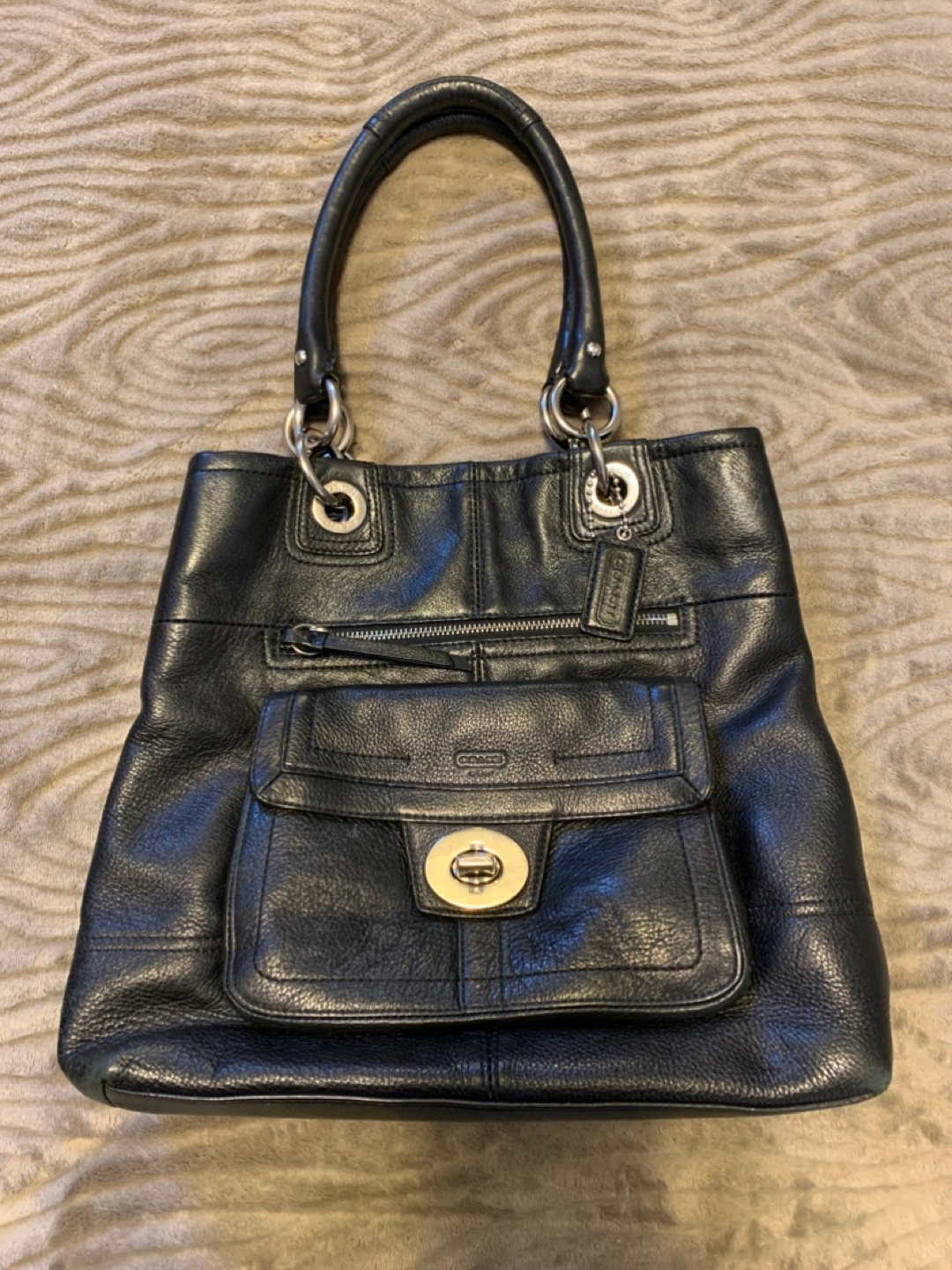Black leather tote bag. Features two top handles, a zip closure, and multiple pockets. Silver-toned hardware. Coach branding visible throughout. Needs some restoration to bring back its original lustre, reflected in price.