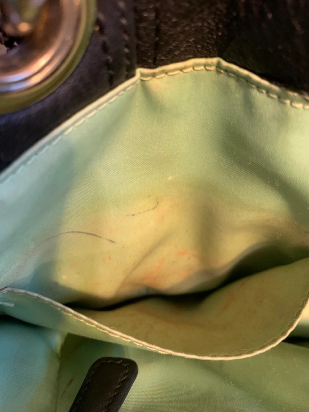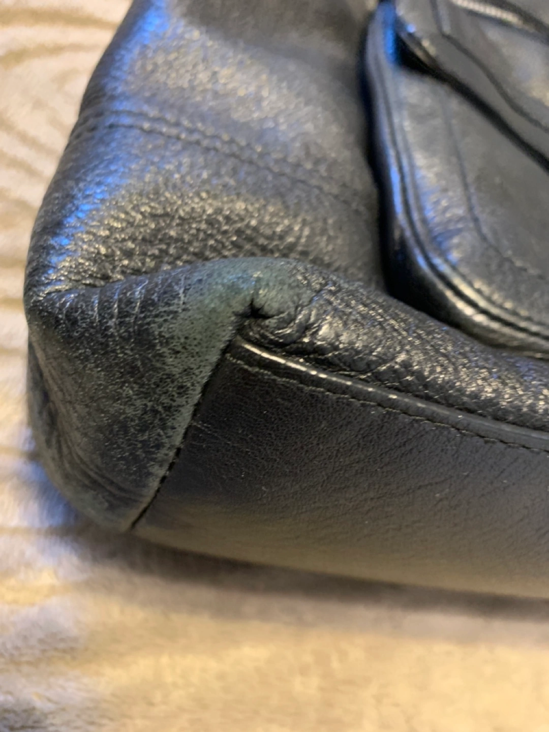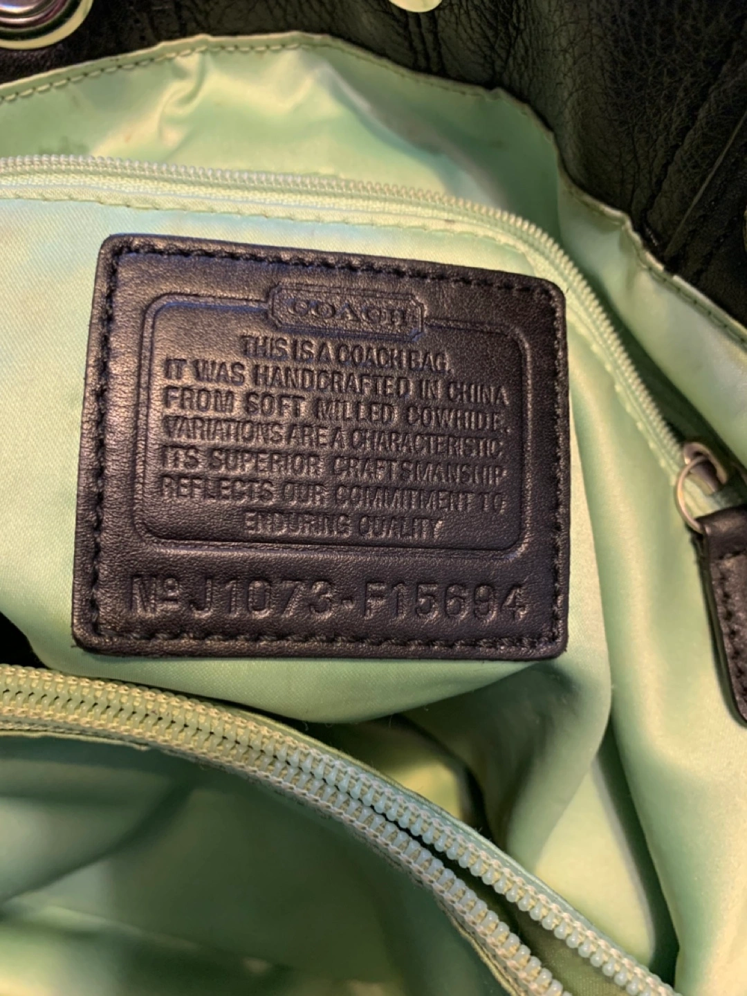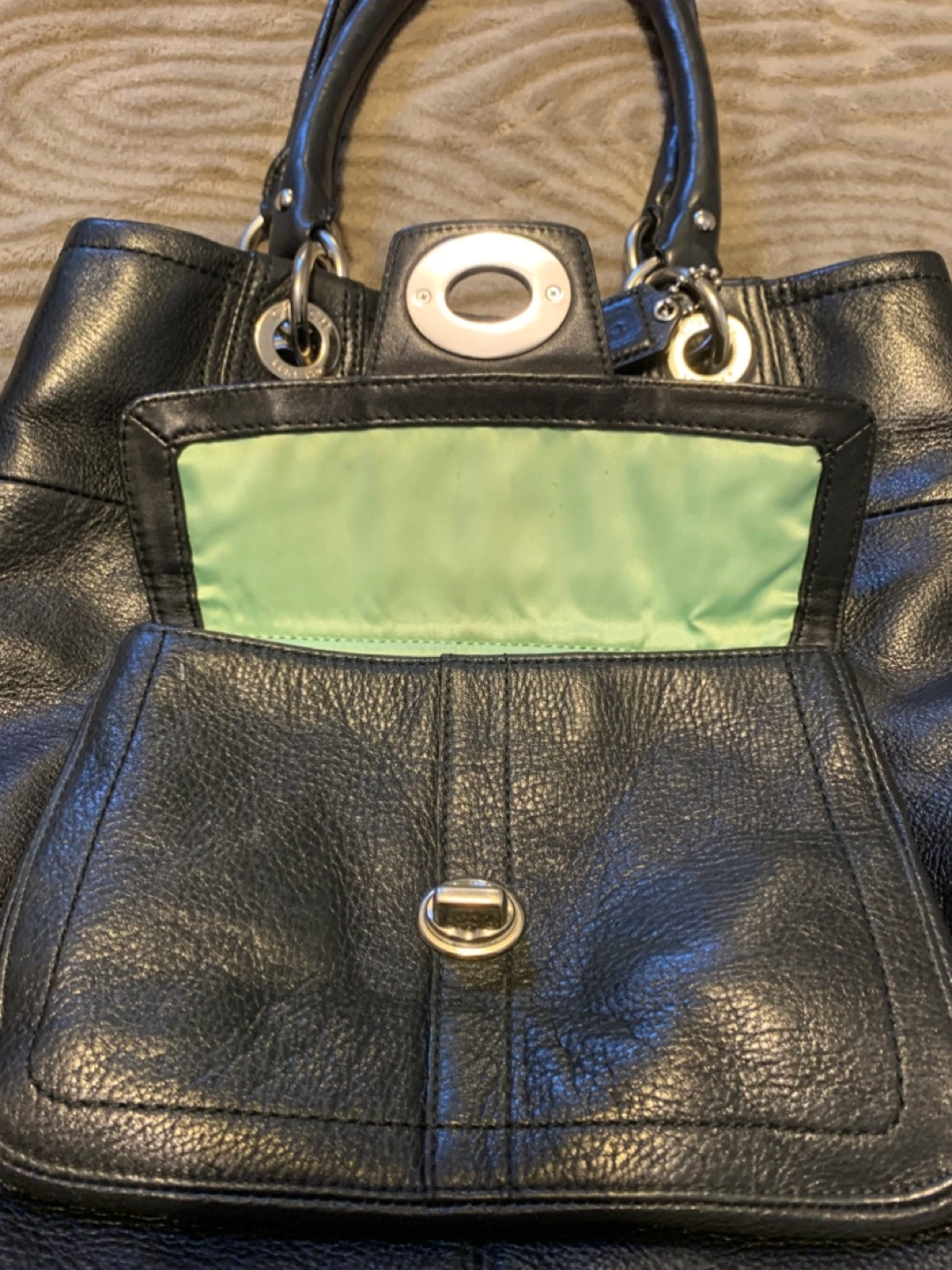Black leather tote bag. Features two top handles, a zip closure, and multiple pockets. Silver-toned hardware. Coach branding visible throughout. Needs some restoration to bring back its original lustre, reflected in price.