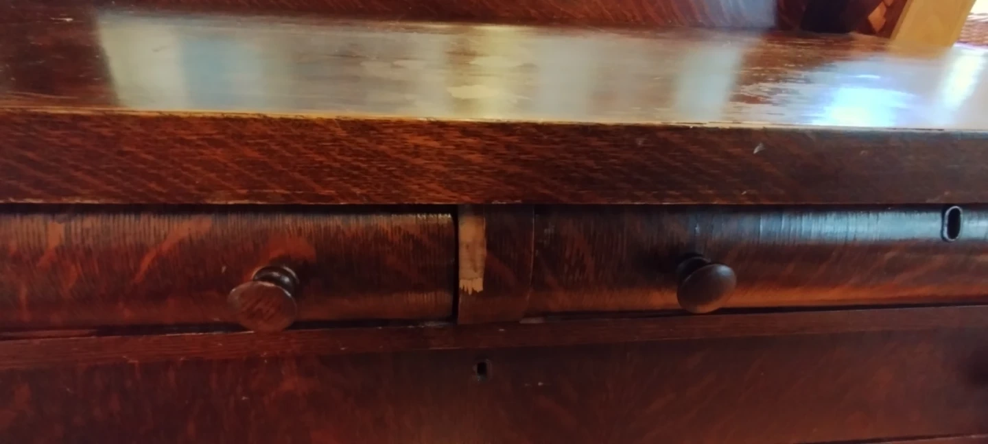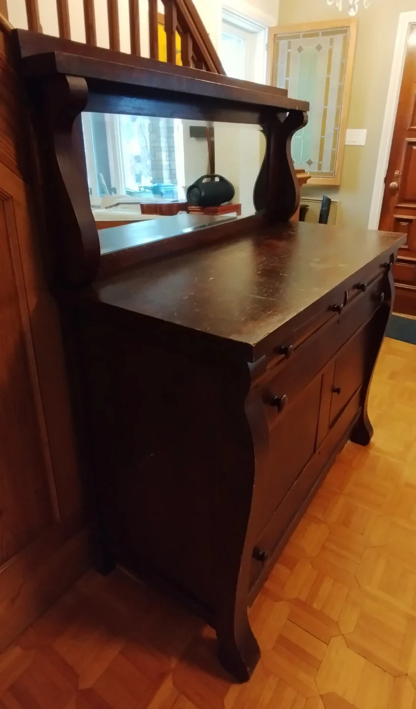 This antique dresser is made of dark wood and features a large mirror. It has multiple drawers and cabinets for storage. There's some wear and tear on the bottom edges and some drawer fronts, consistent with its age. Missing one knob. Also considered a side board . Needs restauration