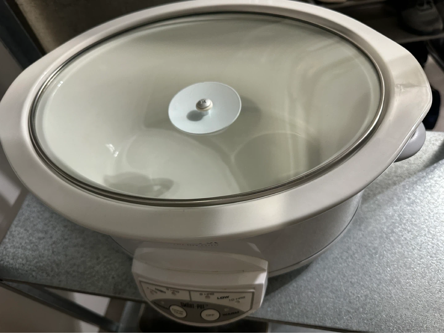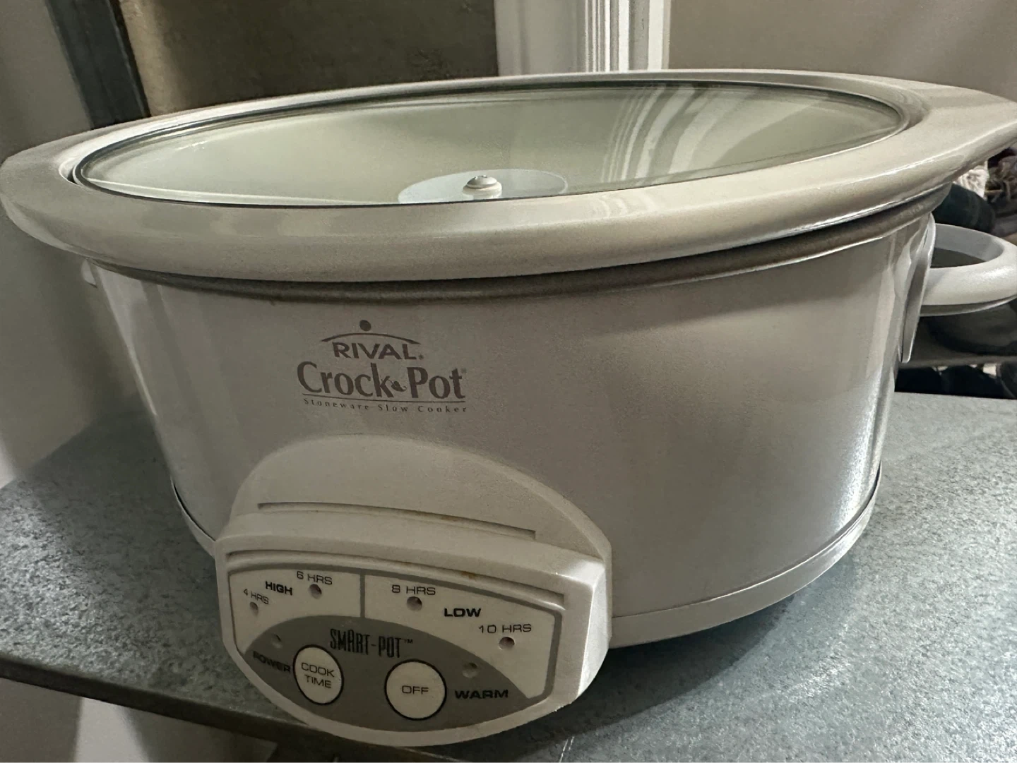 8 Quartz This is a Rival Crock-Pot stoneware slow cooker. It has "Smart-Pot" technology with multiple heat settings including warm, low, and high, with timer options. The lid is glass and it has two side handles.