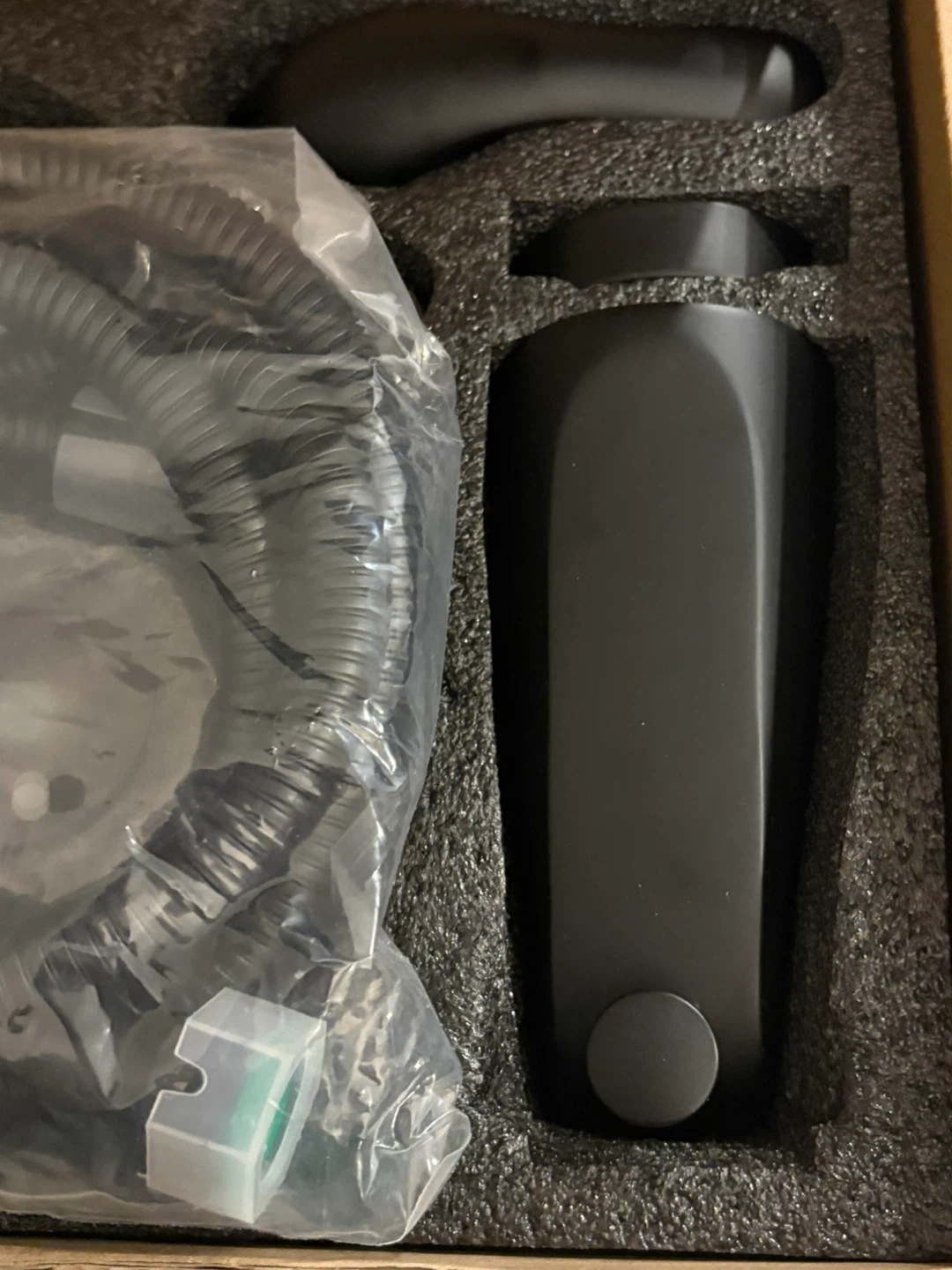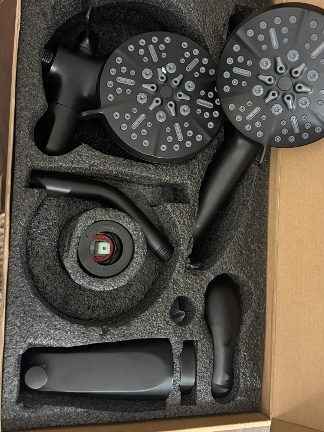 This is a black shower head combo set. It includes a rainfall shower head and a handheld shower head. Made of durable material.hot and cold set up and bathtub as well .