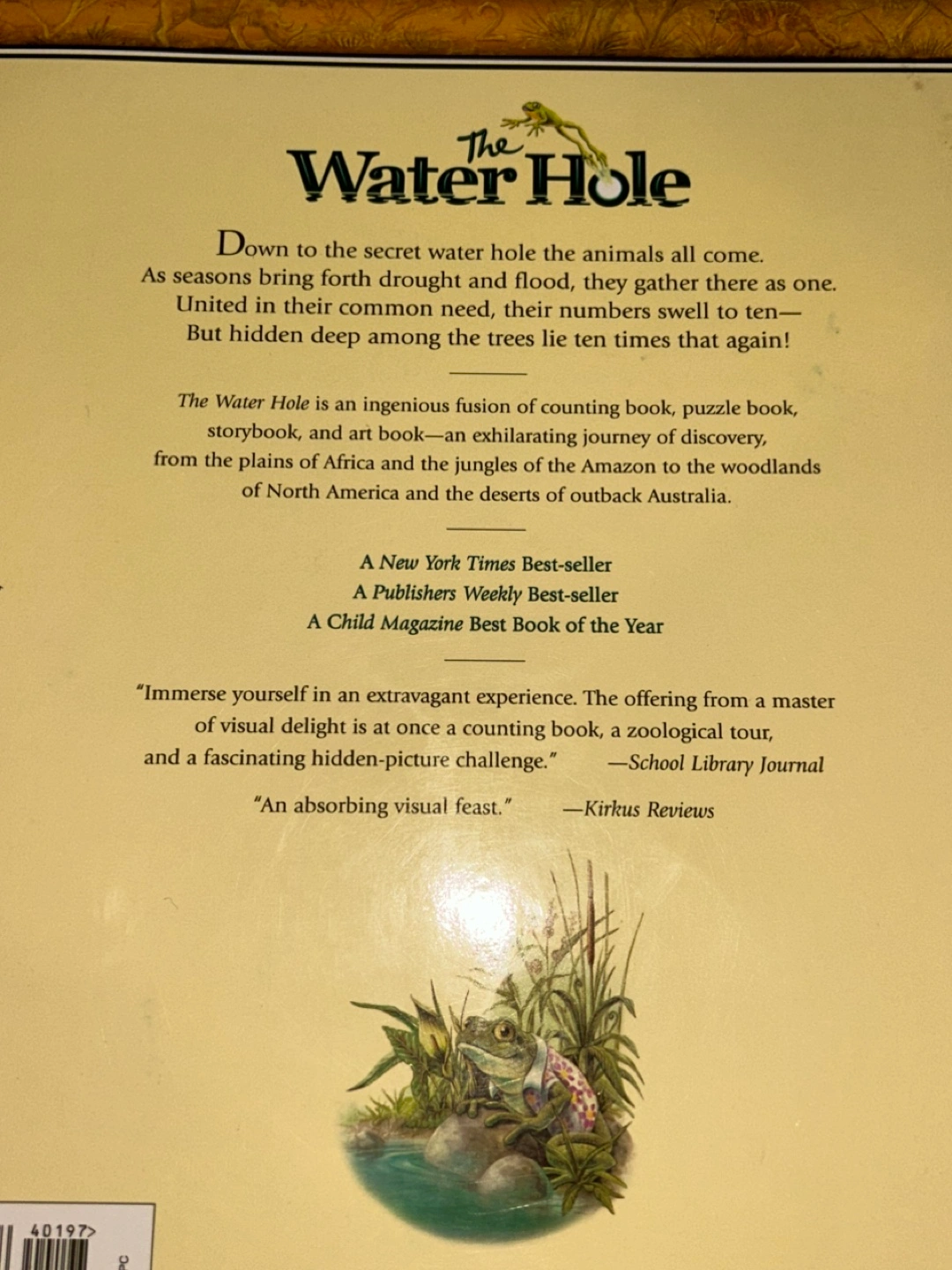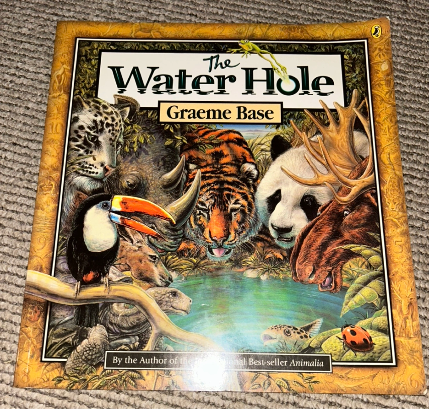 Selling a copy of "The Water Hole" by Graeme Base! It's a counting book, storybook, and art book all in one. It's a journey of discovery from the plains of Africa to the jungles of the Amazon and the woodlands of North America and the deserts of outback Australia. A New York Times Best-seller and a Publishers Weekly Best-seller!