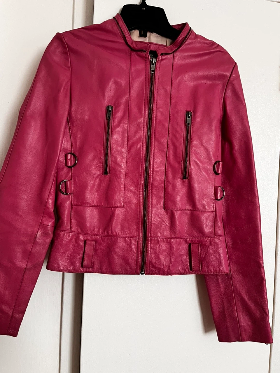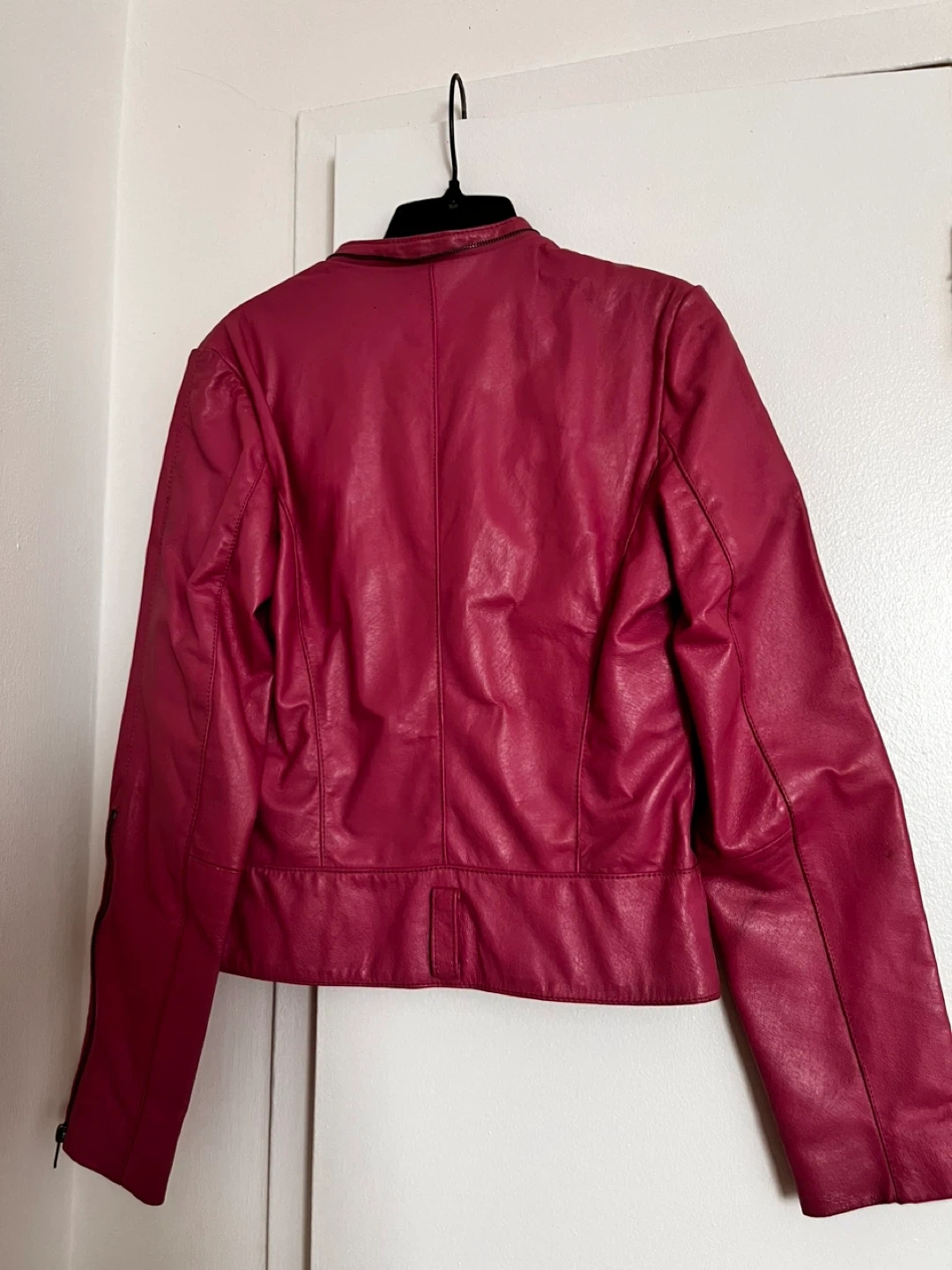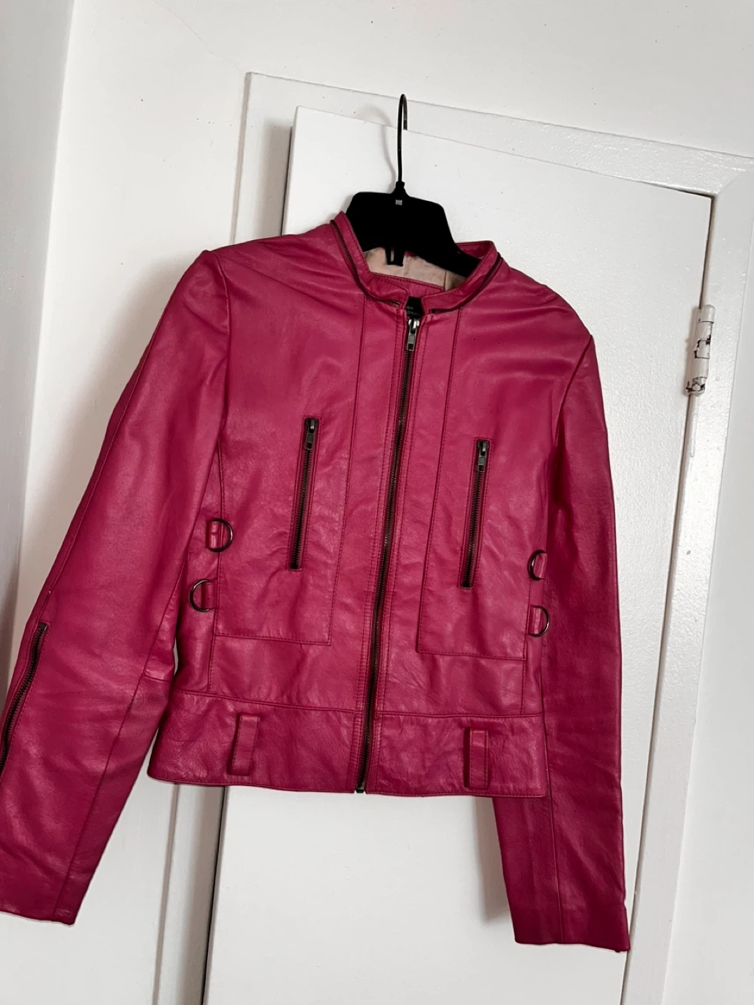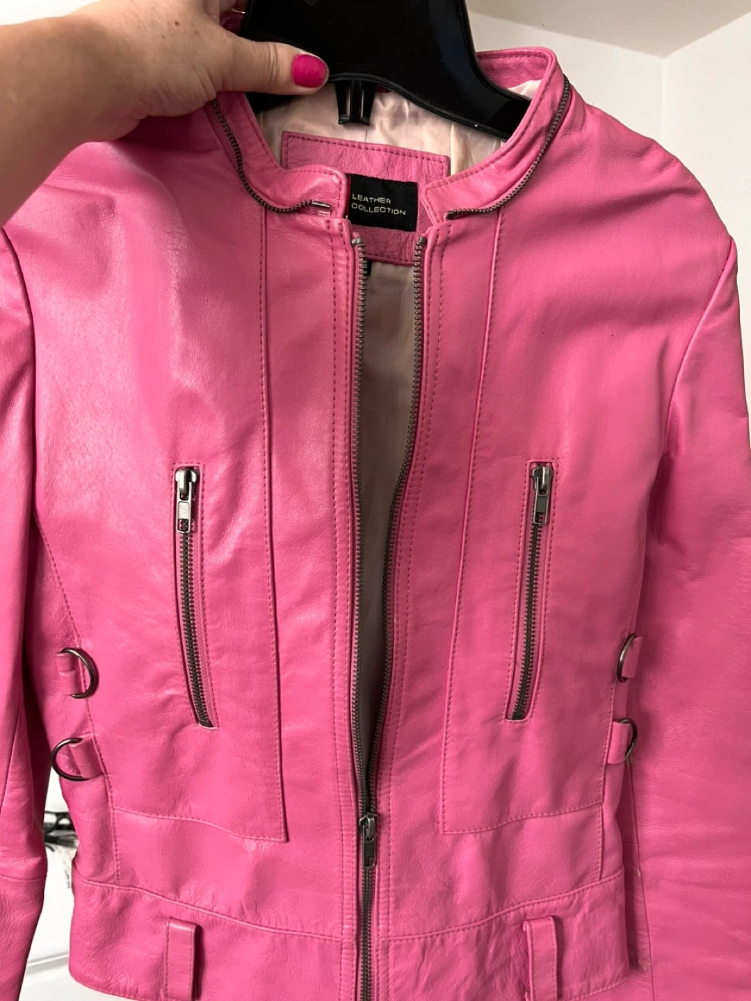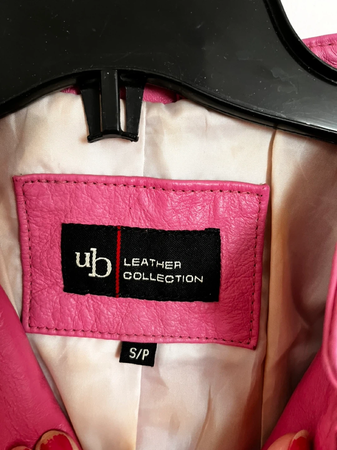 Cute UB Leather Collection pink moto-style jacket. Real genuine leather. Zipper closure with multiple pockets. Size S/P. Other clothing available, good deals, try on available.