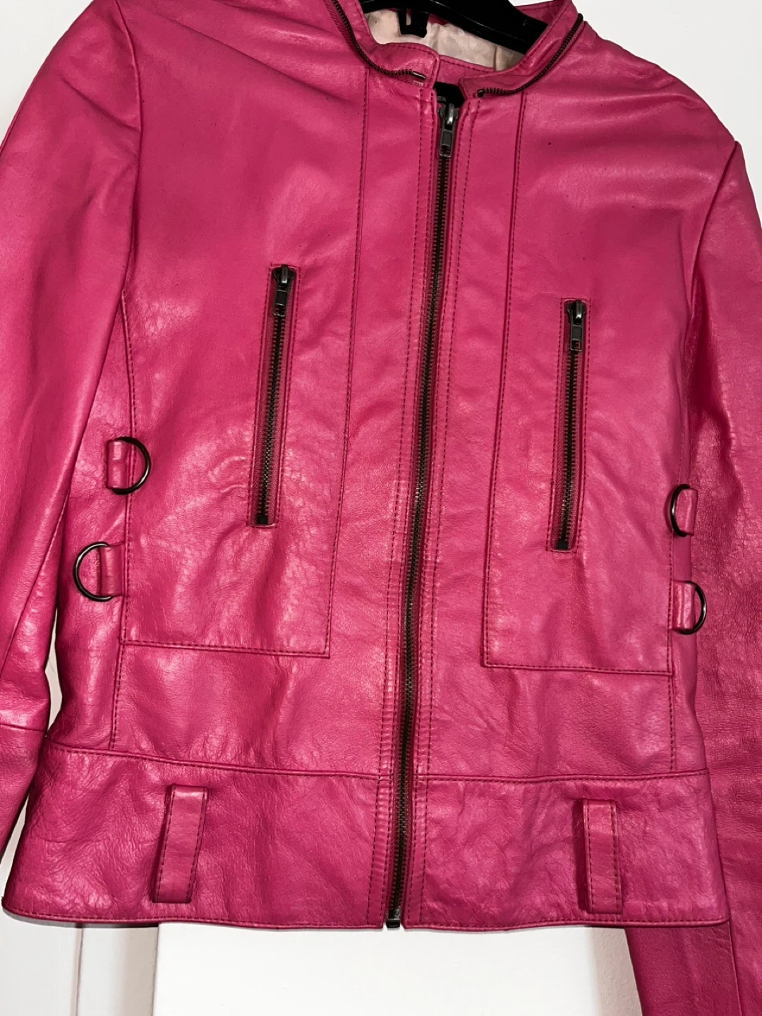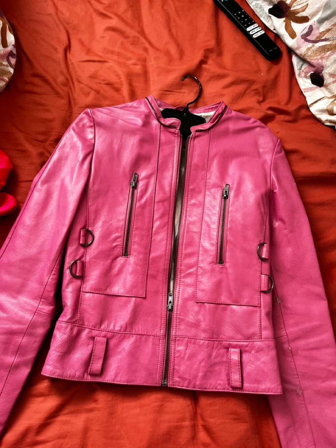 Cute UB Leather Collection pink moto-style jacket. Real genuine leather. Zipper closure with multiple pockets. Size S/P. Other clothing available, good deals, try on available.