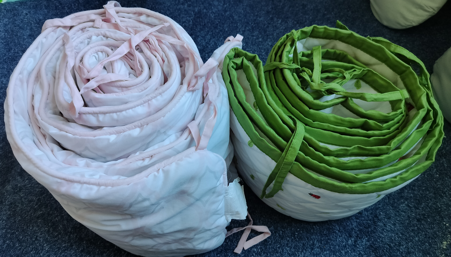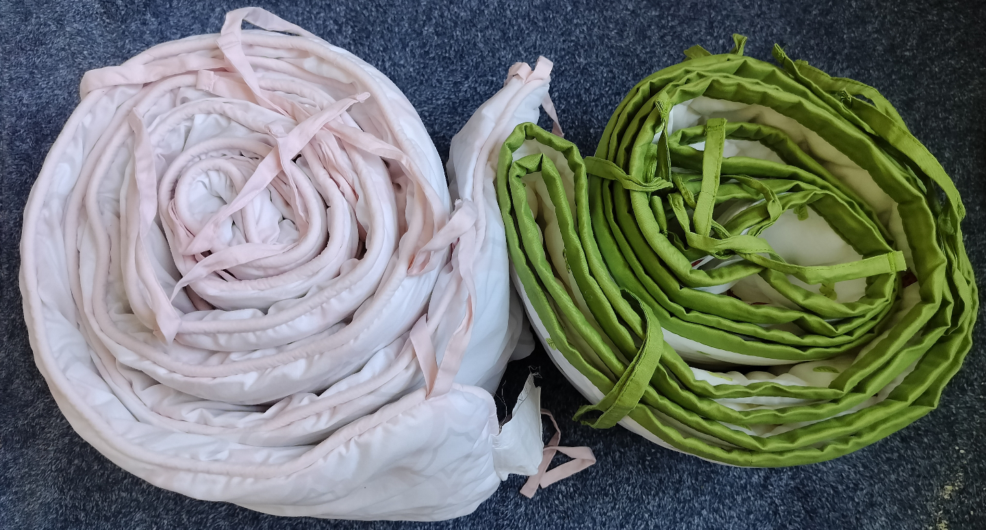 Two crib bumpers, pink and green