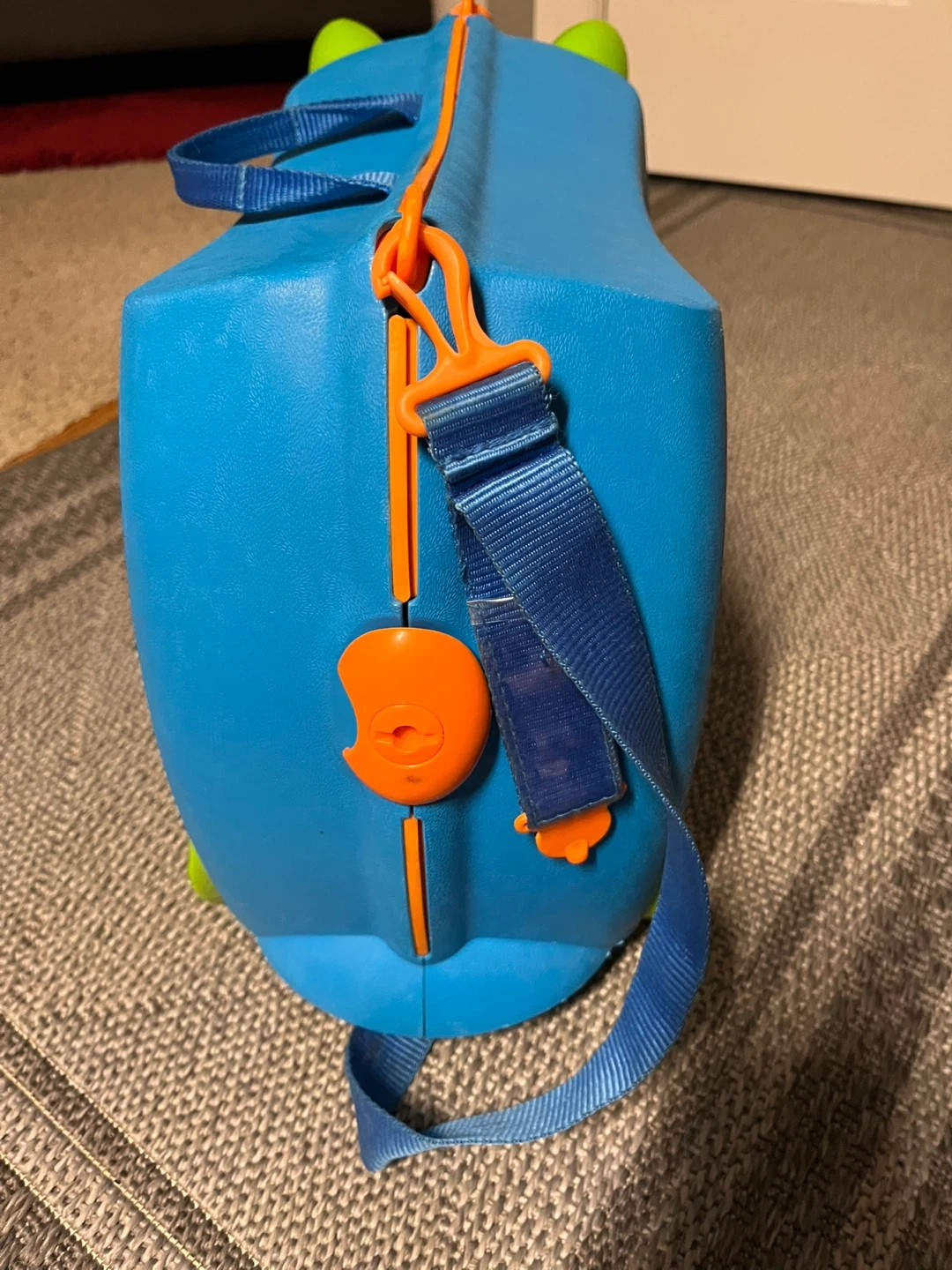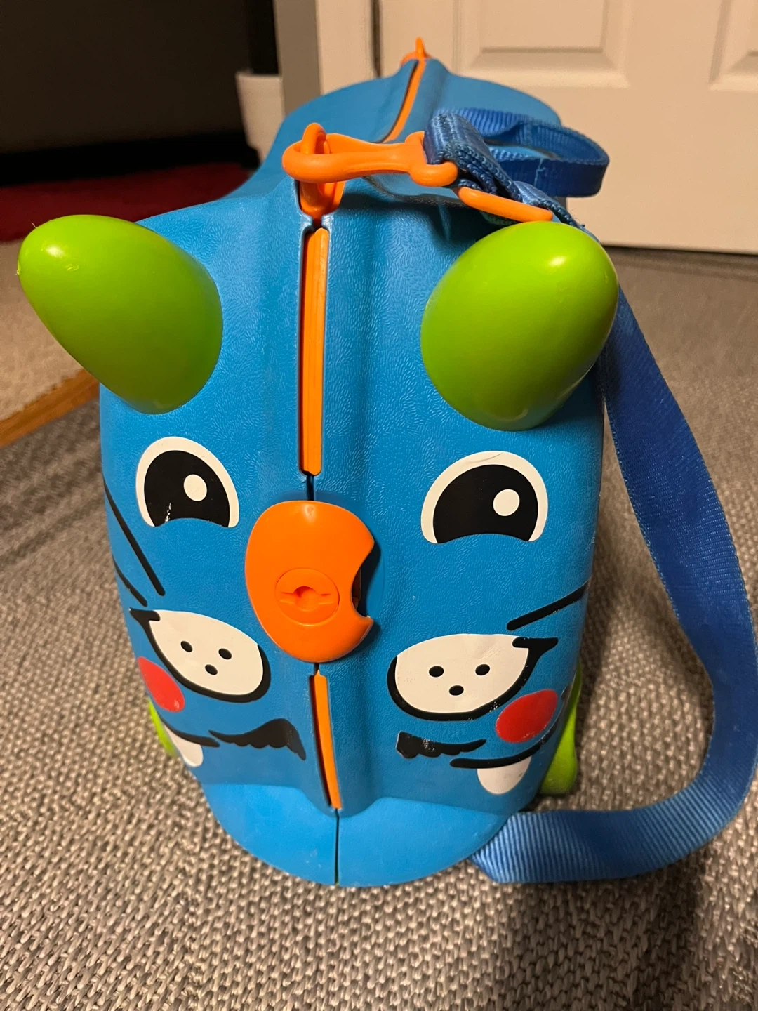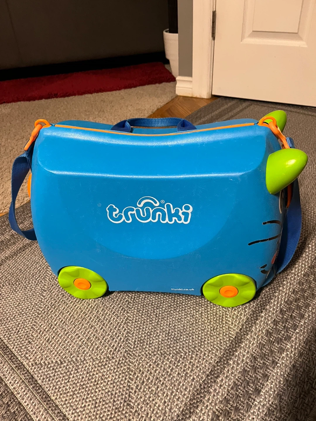 Selling a Trunki ride-on suitcase for kids! It's in great shape and ready for its next adventure. This blue suitcase is perfect for travel and keeping your little one entertained on the go. It also comes with a handy shoulder strap and interior straps to secure belongings