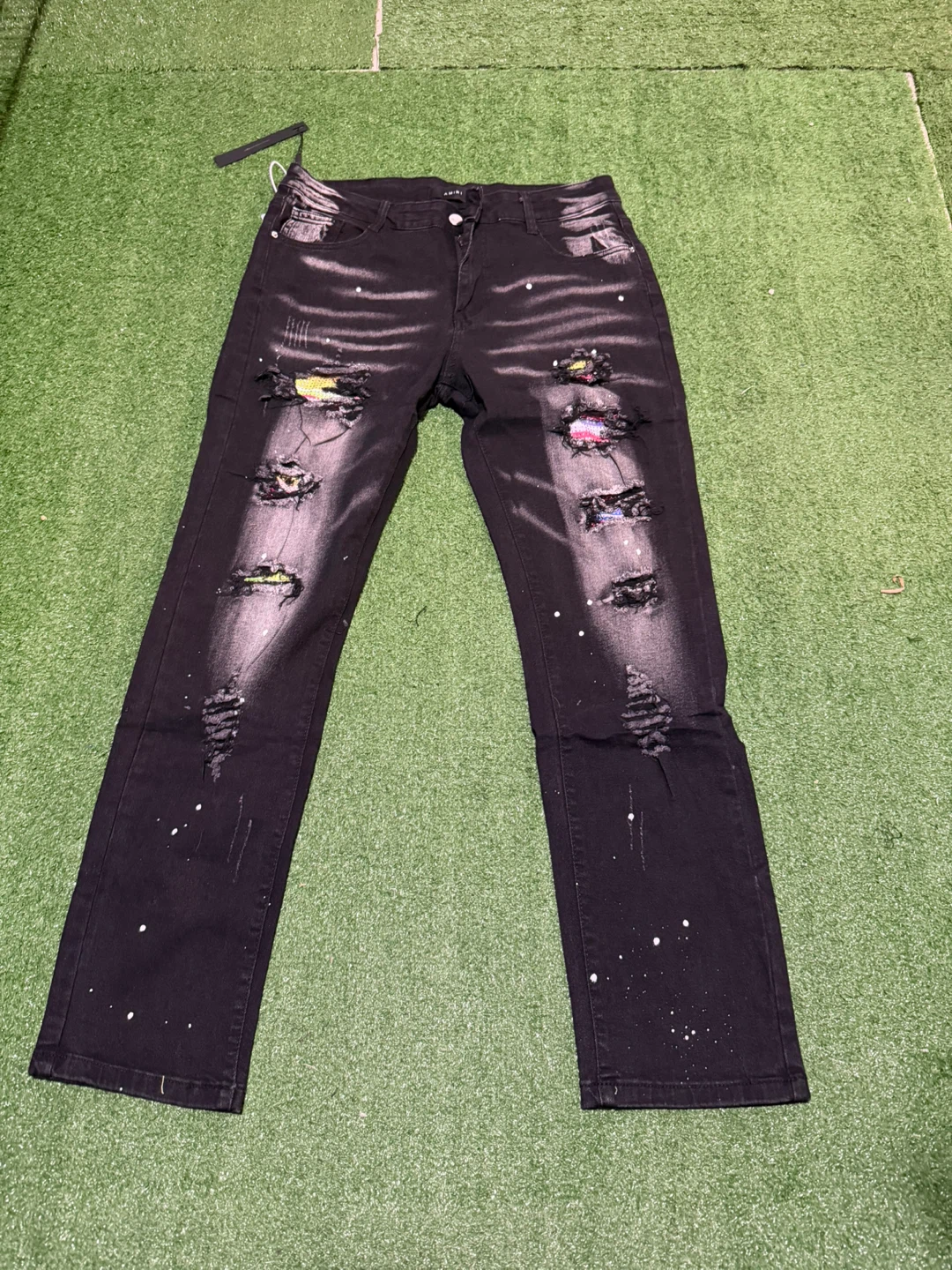AXIX black denim jeans. Features distressed rips with colorful patches and white paint splatters. Button and zip fly closure. It's a size 34.